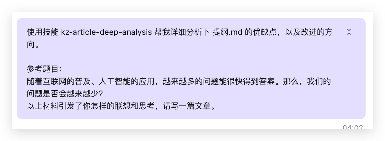 普通 AI 之所以像在“念经”,是因为缺乏特定的工作流和角色约束。我没有让 SOLO 瞎聊,而是直接调用了技能 kz-article-deep-analysis,让它先给女儿的提纲“把把脉”。