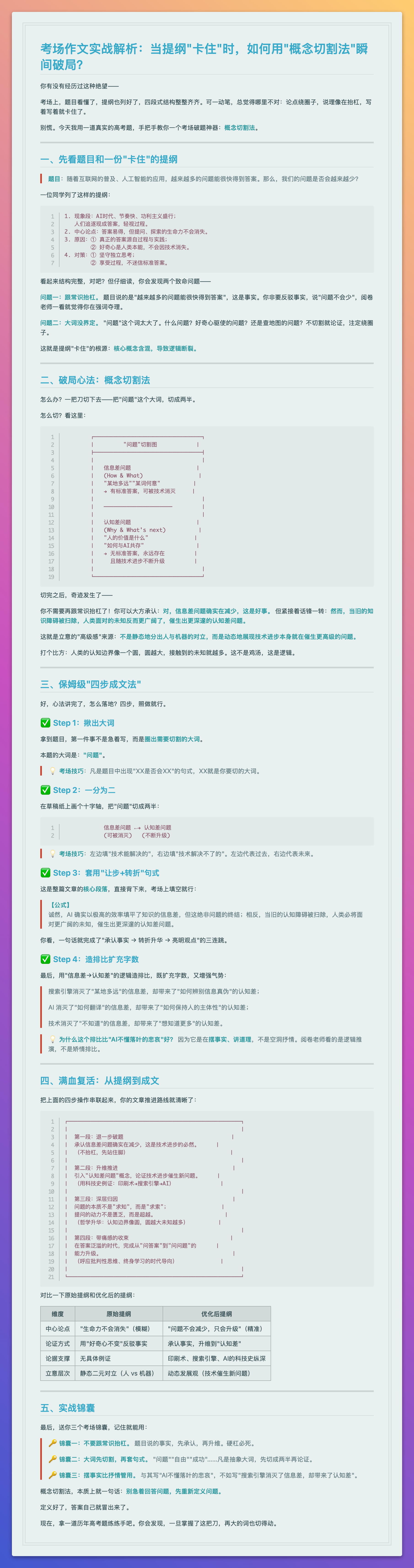 拿着 SOLO 生成的这套“私人订制”资料,我给女儿做了一次深度的复盘。当她看到《考场作文概念切割法指导》里那句“概念切割法,本质上就一句话:别急着回答问题,先重新定义问题。”,再对照着看《范文》里的实战运用时,瞬间醍醐灌顶:“老爸,我终于明白考场上该怎么切入这种题了!这比听干巴巴的辅导课有用多了!”