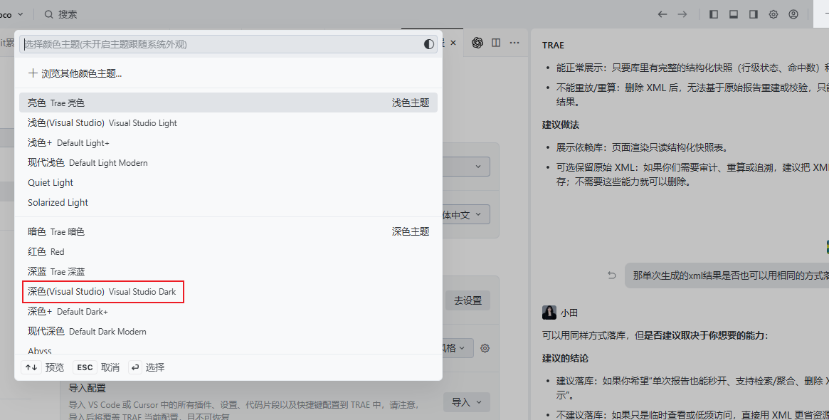 TRAE编辑器能不能改成和vscode一样的主题, 刚开始使用视图看着很不习惯, 已经修改了主题色但是和vscode还是不太一样, 像Qoder就和vscode一样