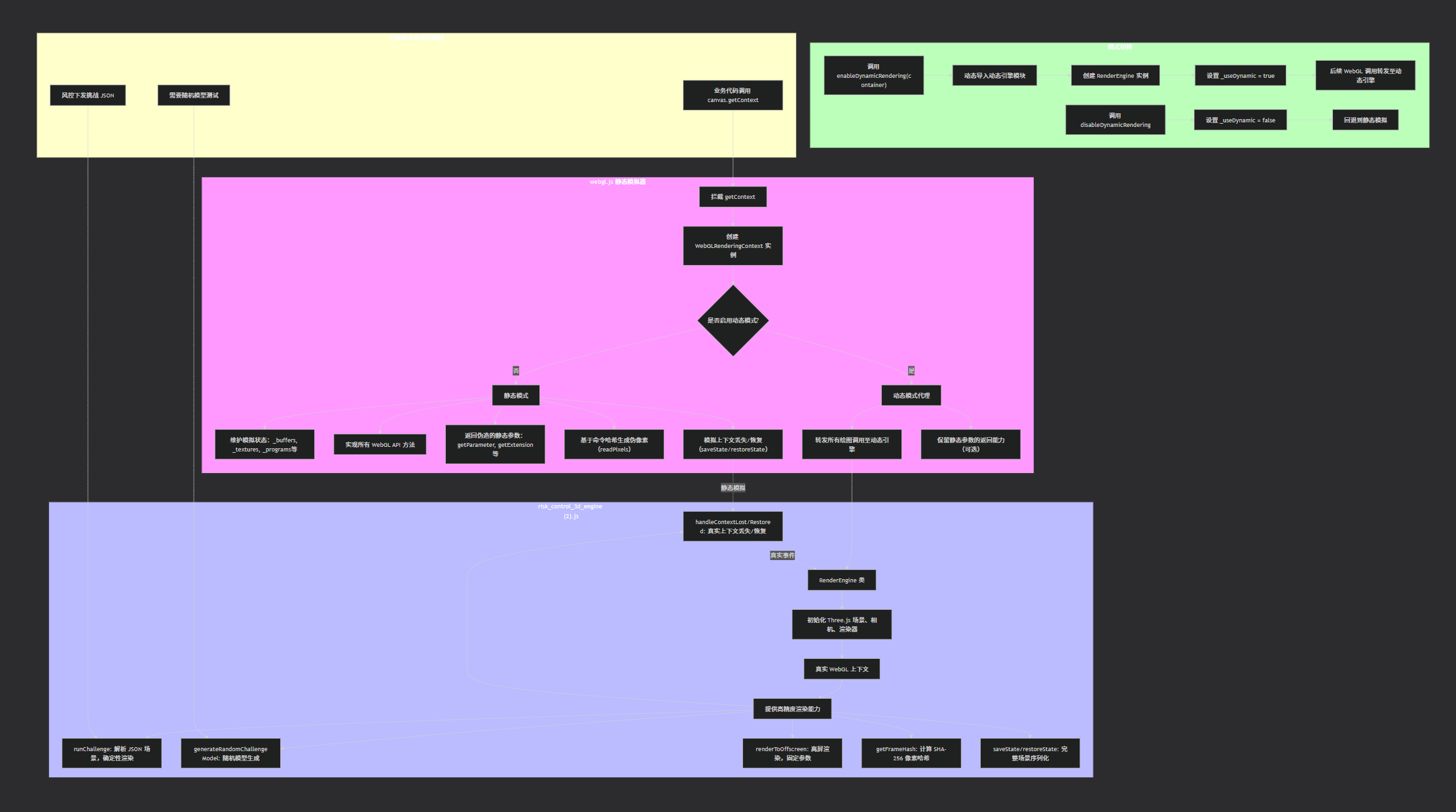 通过条件:动态模块具备动态生成随机模型的能力,且每次渲染结果由真实 GPU 产生,哈希不可预测,如果使用静态数据繁琐困难易被检测不划算所有没有存储静态数据。