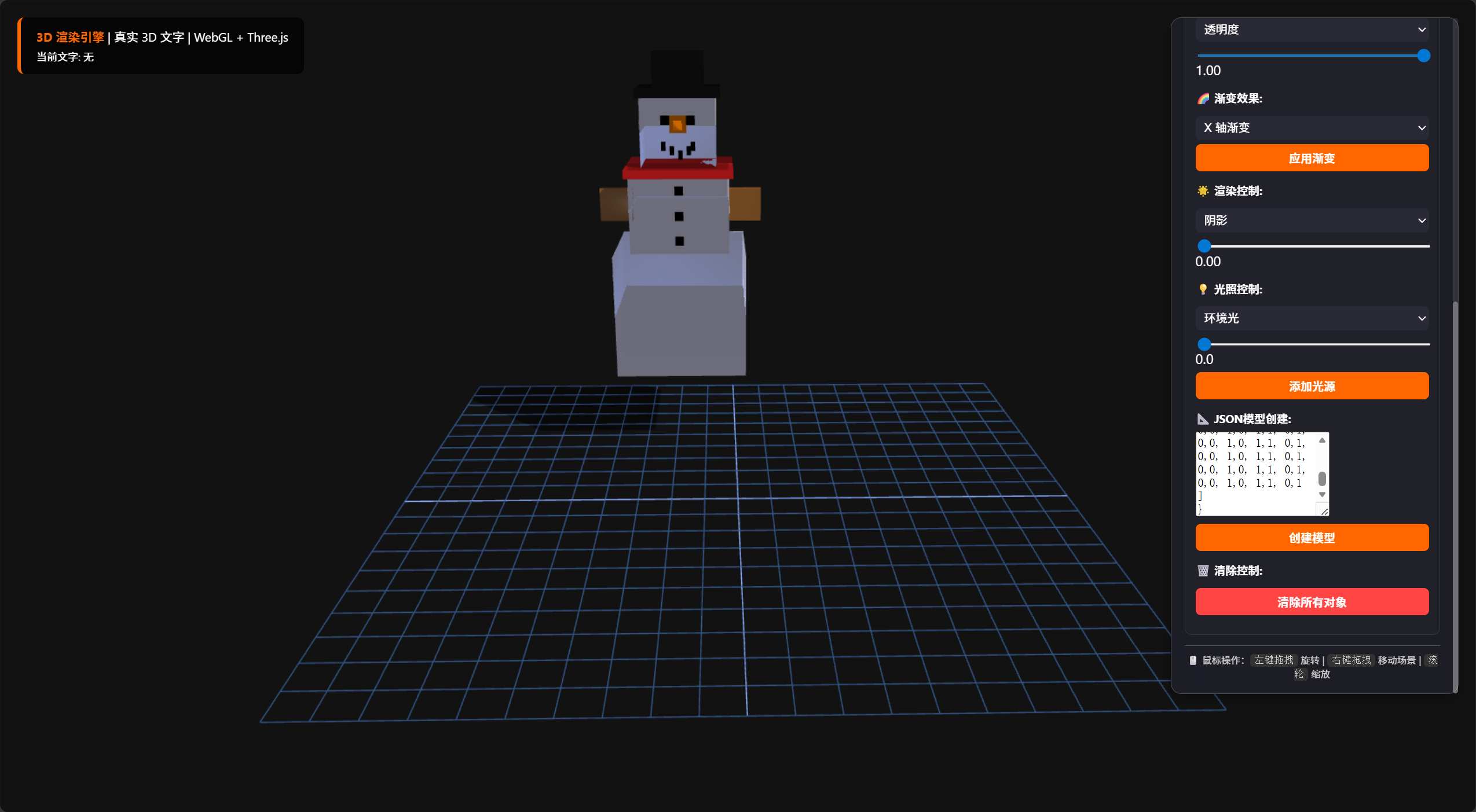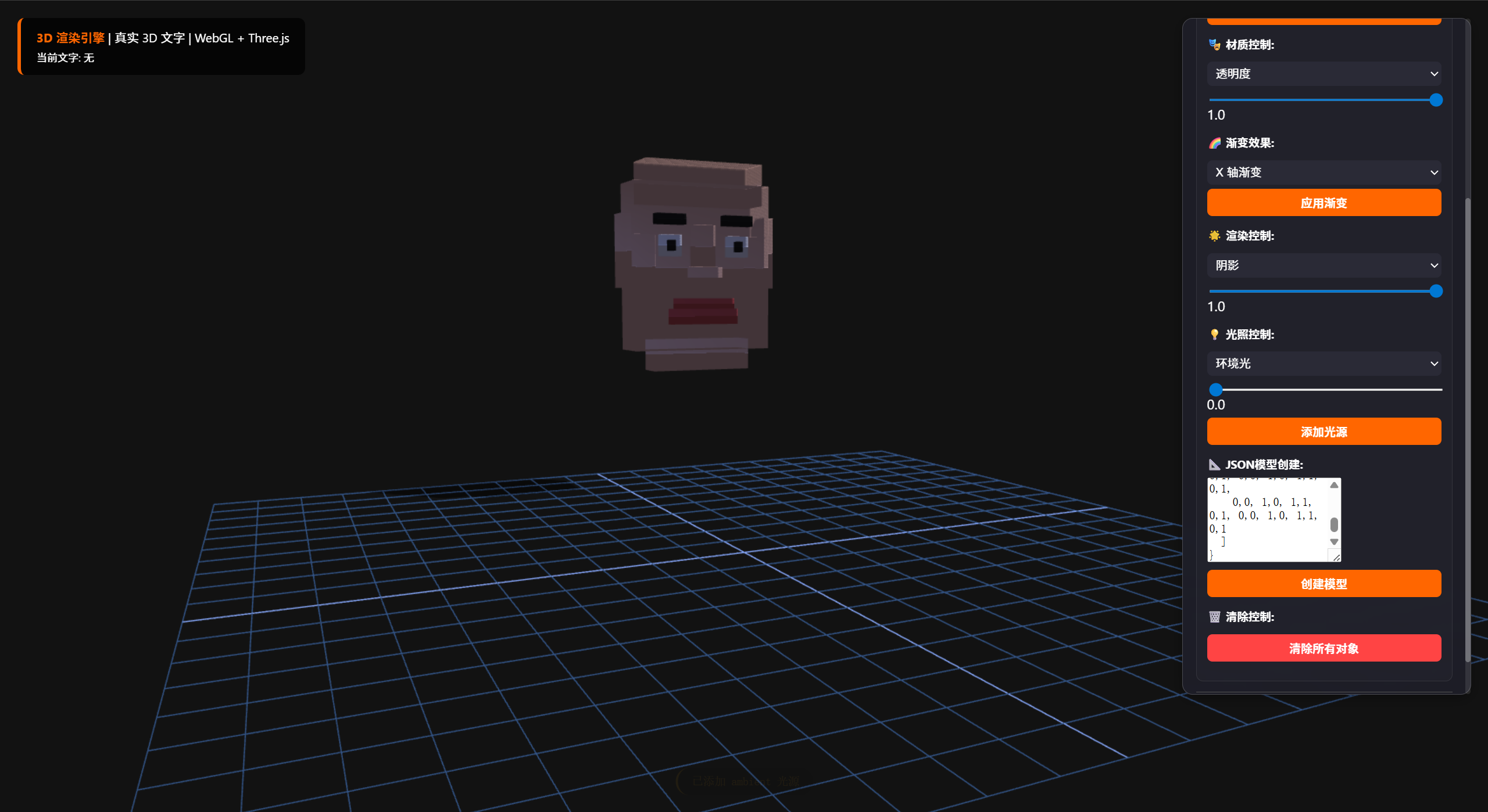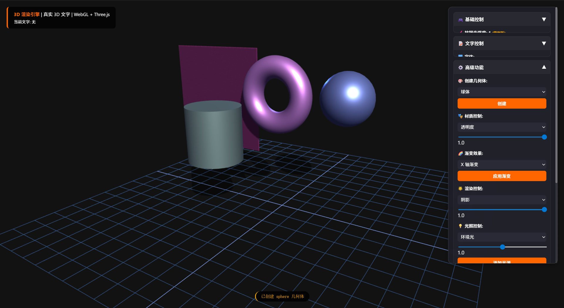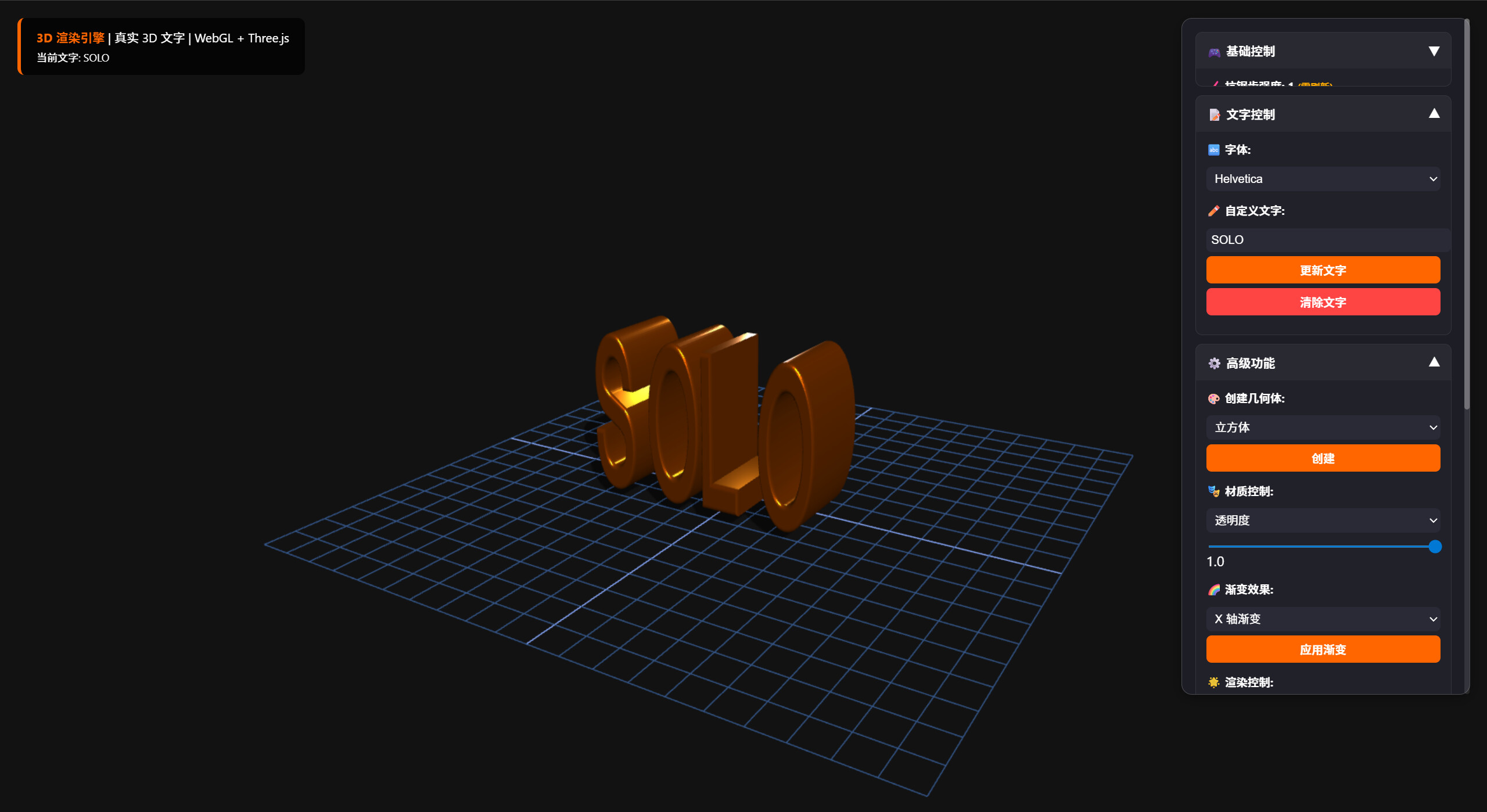 基于webgl+three.js,SOLO帮助我攥写了一个html3D渲染软件,可以实现文字渲染,平面立体图形渲染,甚至自定义渲染,支持自定义调节各种高级参数(光源,雾效,阴影,渐变,抗锯齿…)