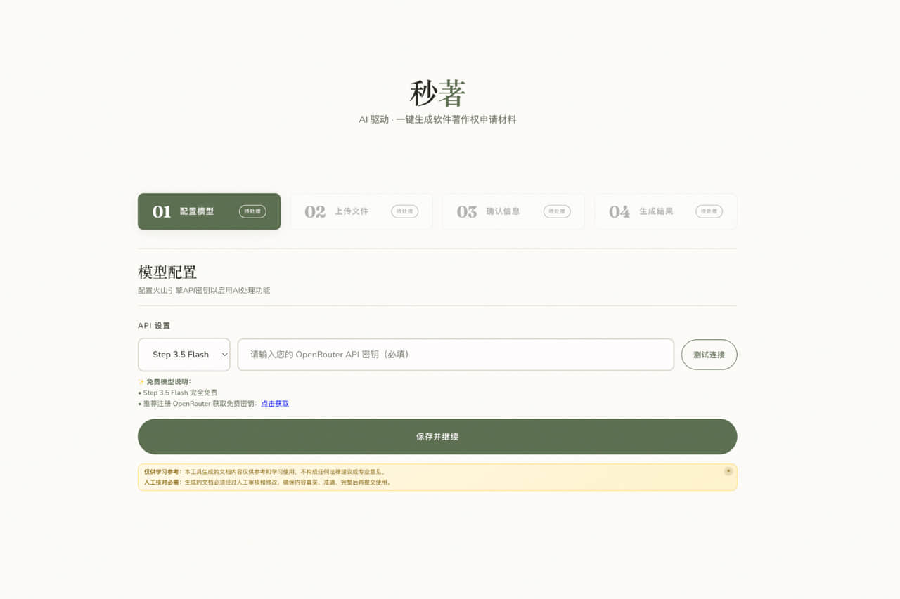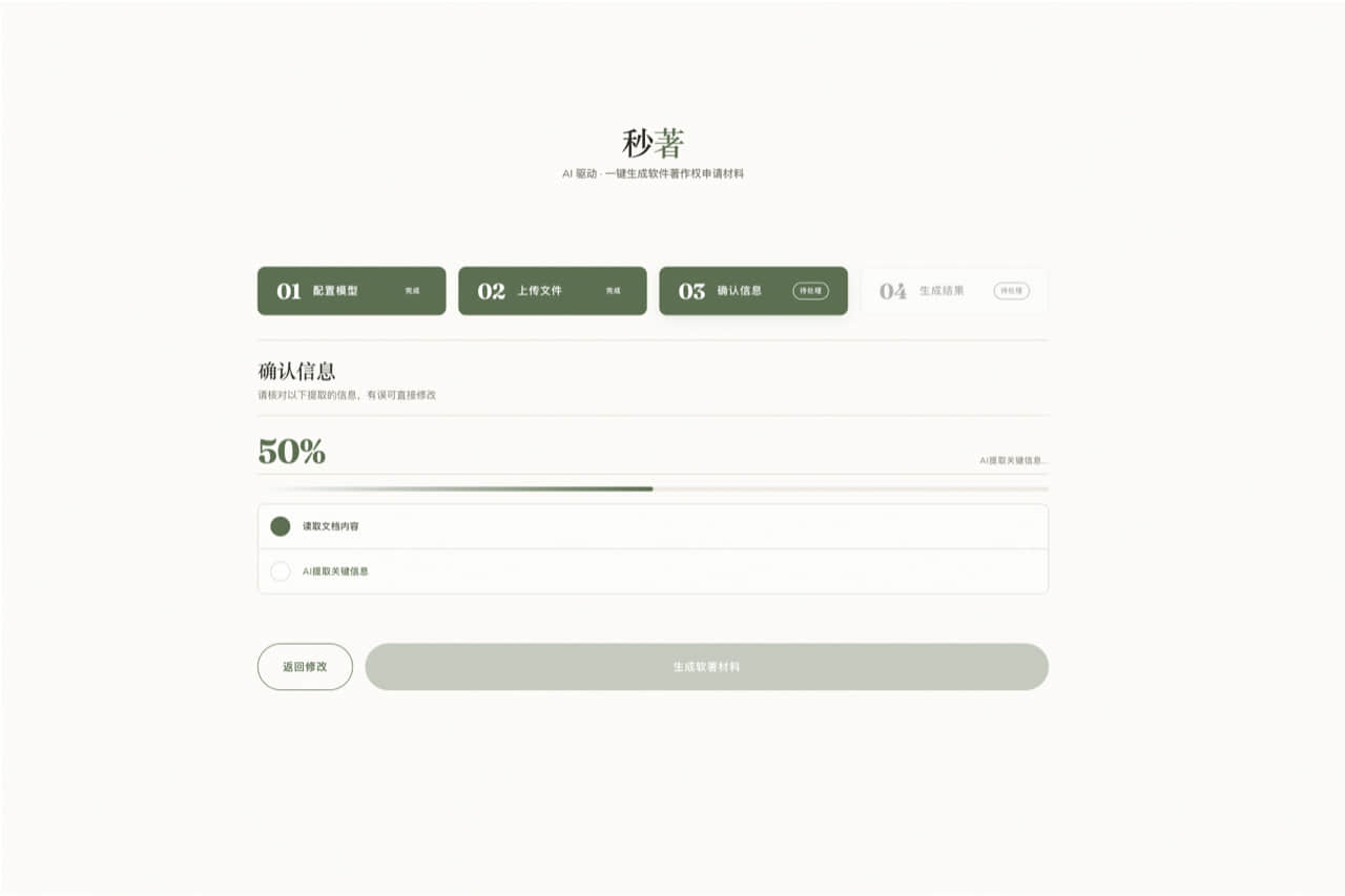 | 产品名称 | 秒著 - AI 软著材料生成工具 |