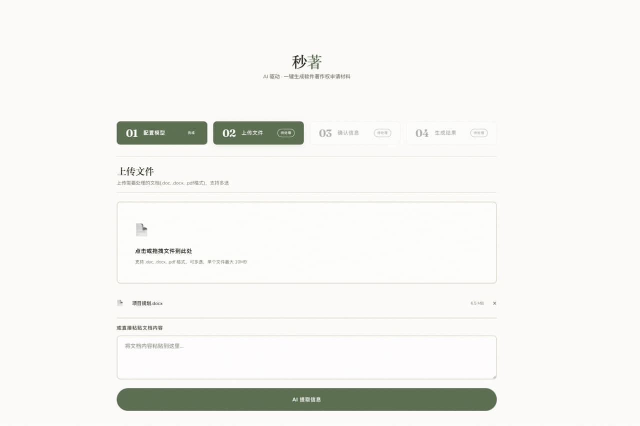 AI 提取 → 从文档中提取软件名称、功能描述、技术特点