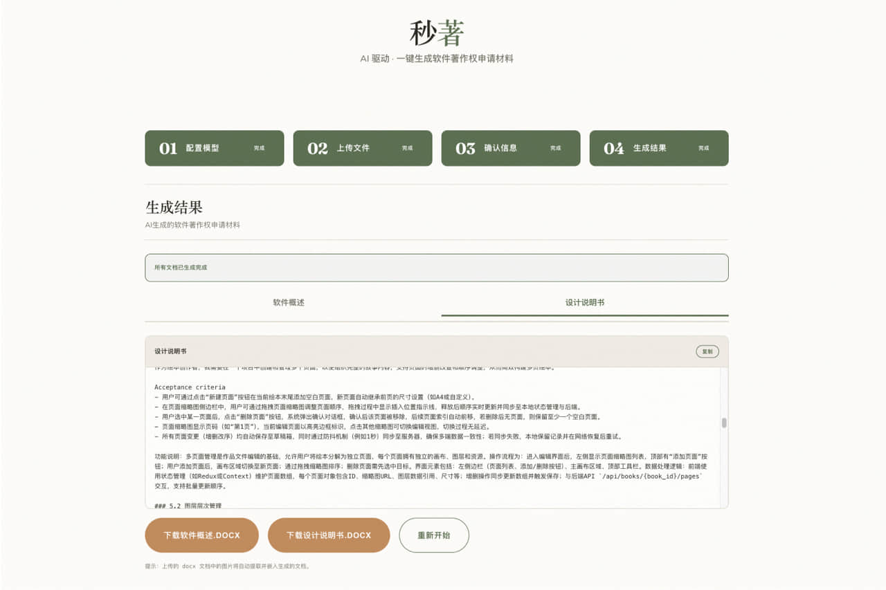 帮我设计一个软件著作权申请材料的自动生成系统 - 输入:项目文档(Word/PDF)+ API Key - 输出:软件概述.docx + 设计说明书.docx - 要求:符合国家版权局格式规范,支持图片嵌入
