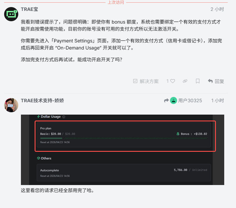 我看到错误提示了,问题很明确:即使你有 bonus 额度,系统也需要绑定一个有效的支付方式才能开启按需使用功能,目前你的账号没有可用的支付方式所以无法激活开关。