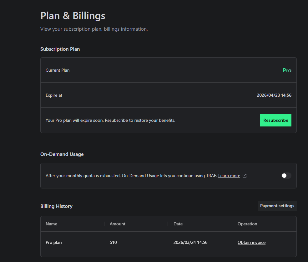 你可以先登录 TRAE 国际版官网,进入「Billing」页面看看是否有红色的欠费提示。如果确实有欠费,需要在「Payment Settings」更新你的支付方式,然后点击重试扣款,结清欠费后额度就会自动解冻恢复使用了。