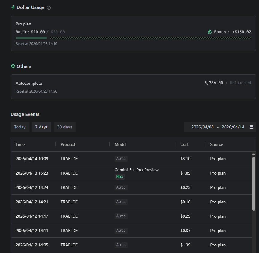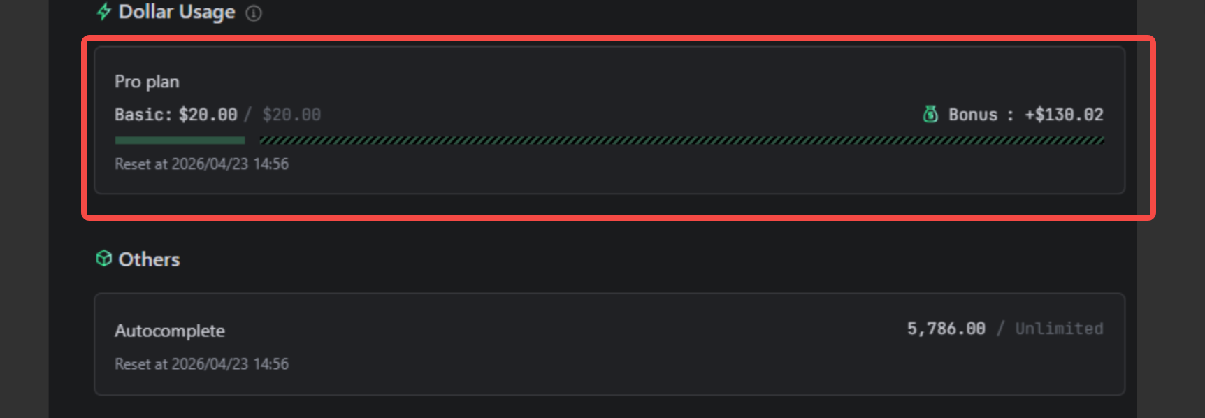 我看到你的情况了,Pro 计划的基础 $20 额度已经用完,但确实还有 $130.02 的 bonus 额度剩余。