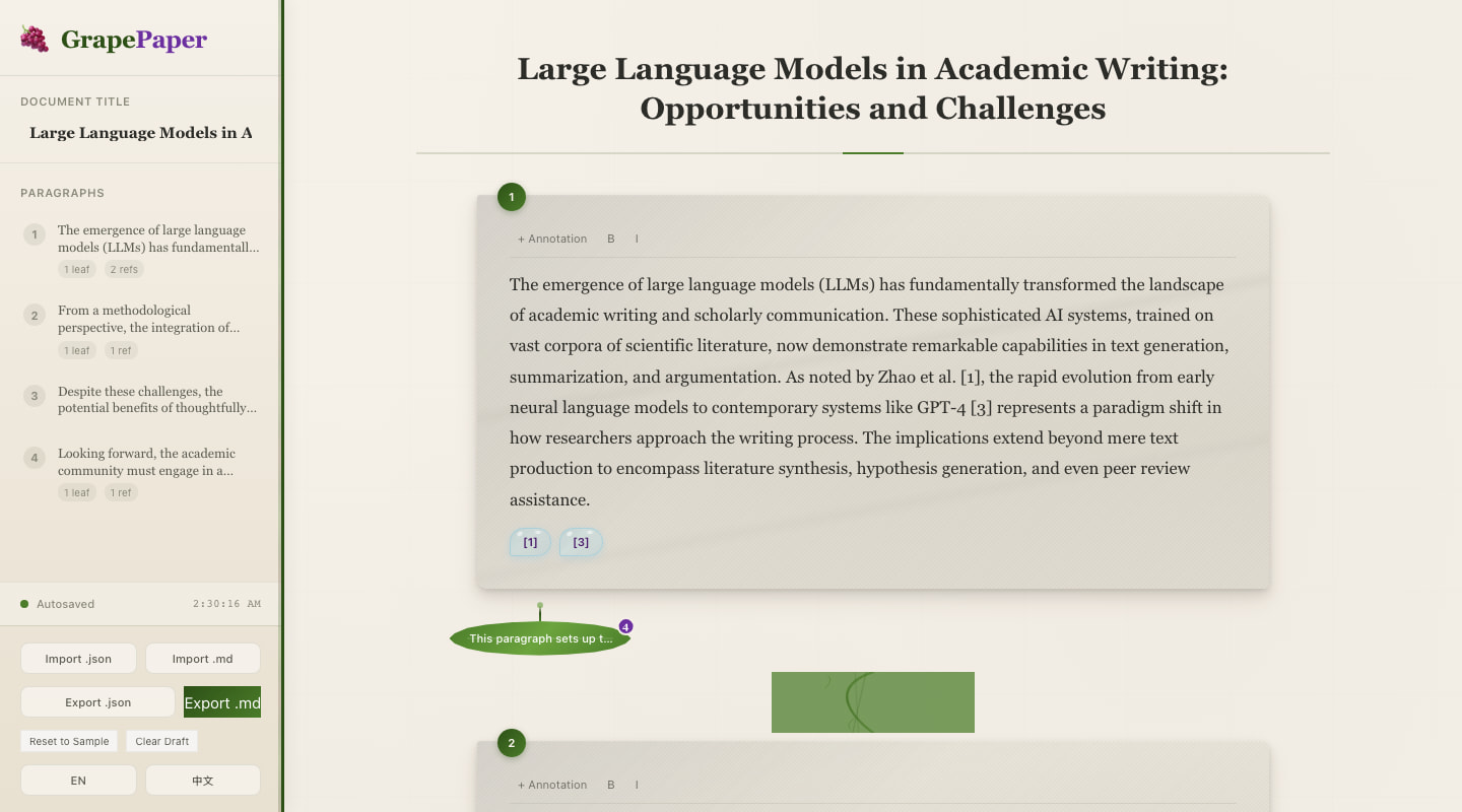 我尝试从零做了一个叫 GrapePaper 的学术编辑器原型:段落被渲染成“石板”,批注像“葡萄叶”一样从段落边缘长出来,引用像“露水”一样附着在文本附近,和批注相关的问题则以侧边聊天面板的形式展开。