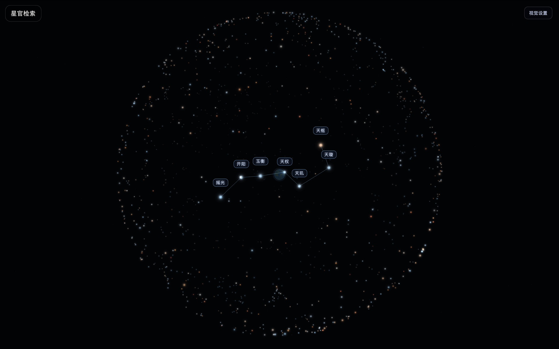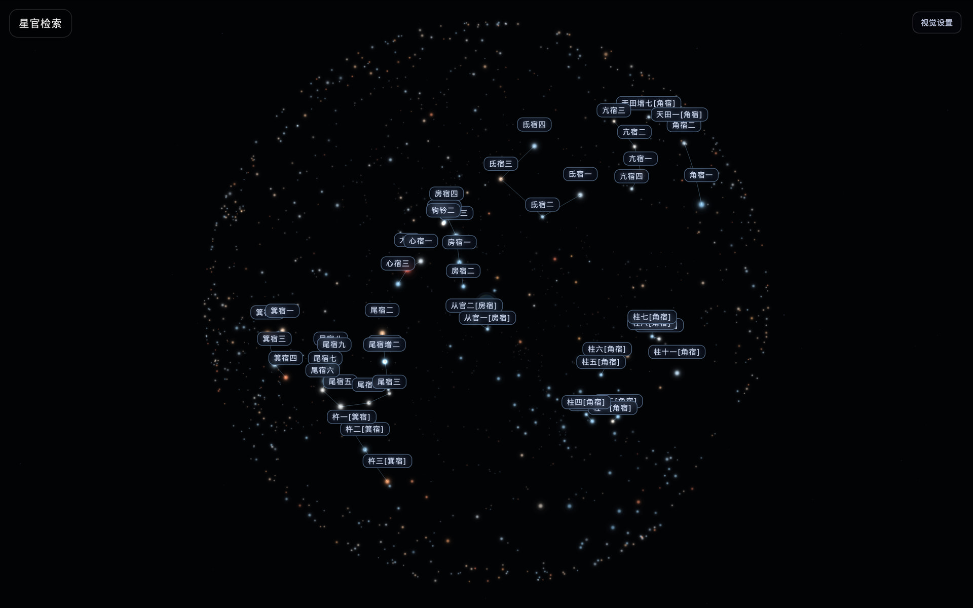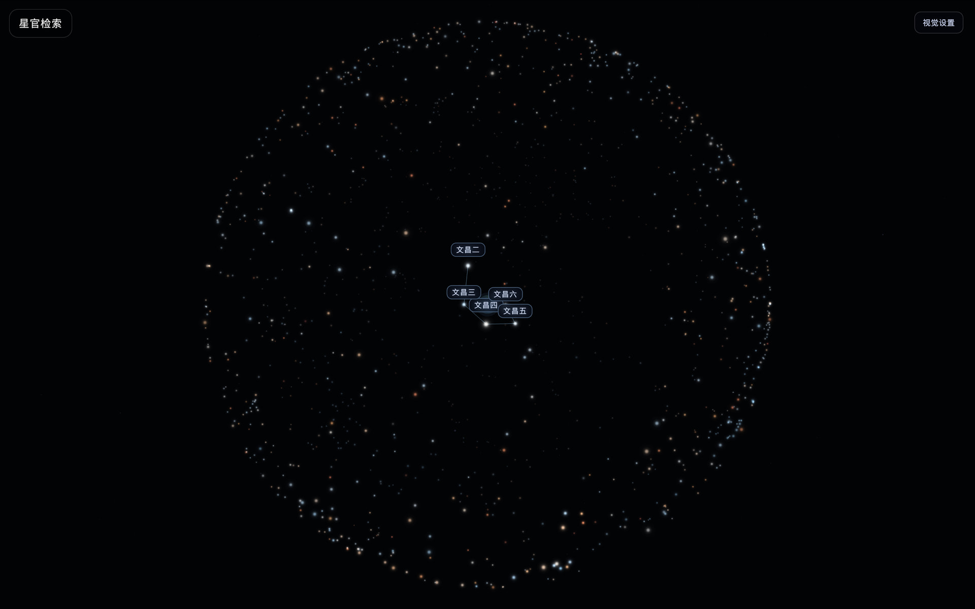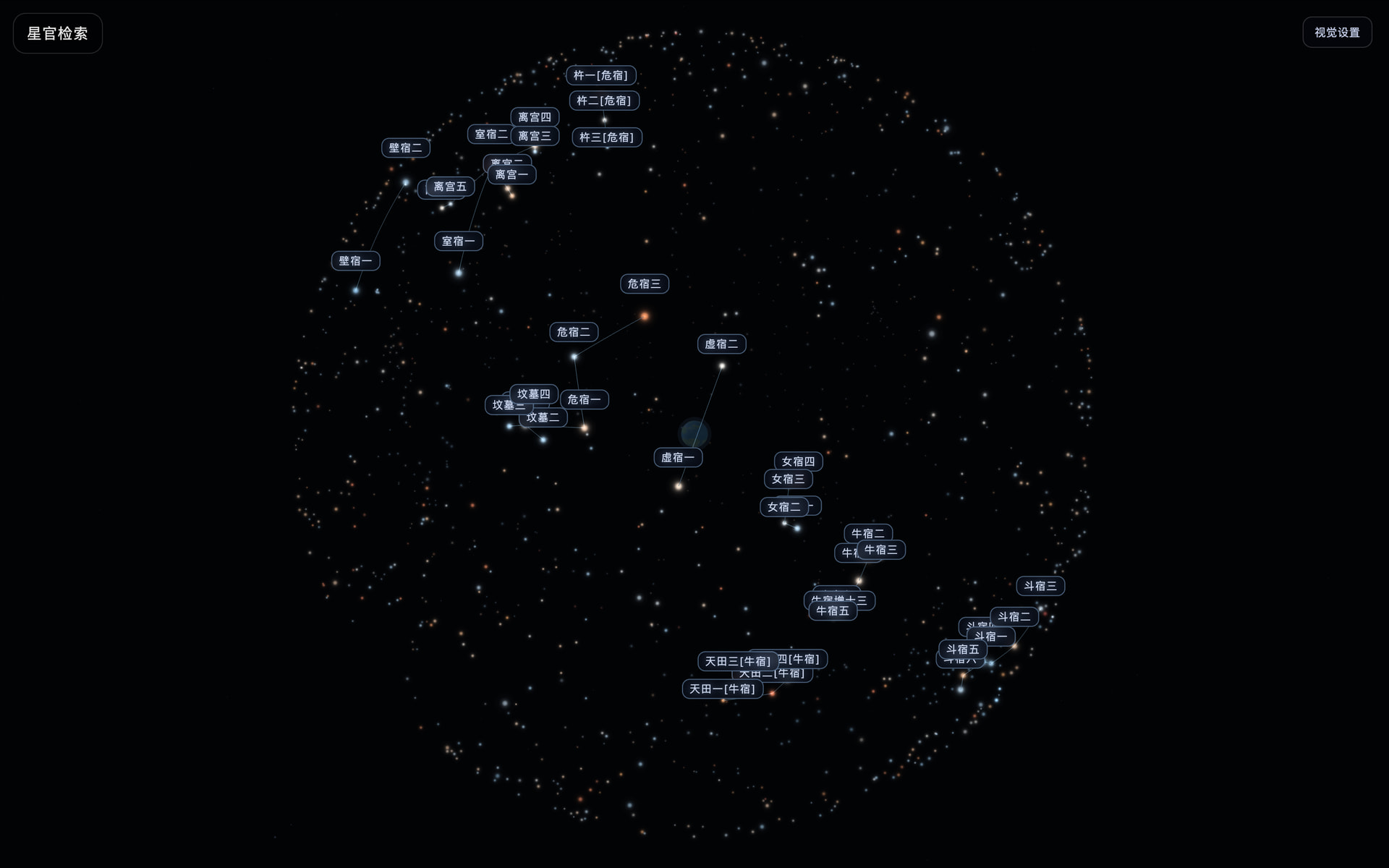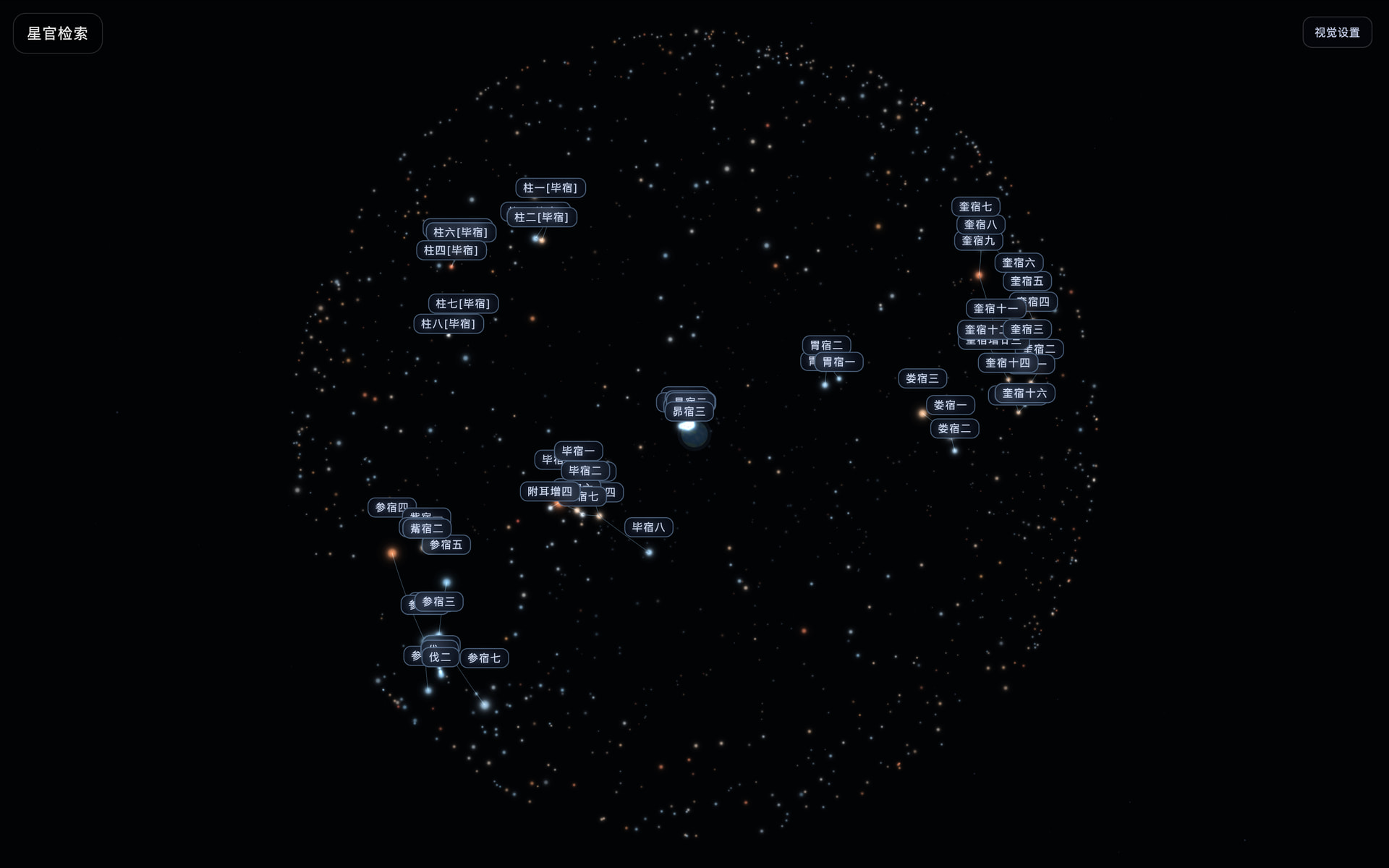 用户不再只是看一张静态星图,而是可以在星空中拖拽漫游、按四象/三垣/星官分组探索,并通过点亮与聚焦理解古代星官结构。