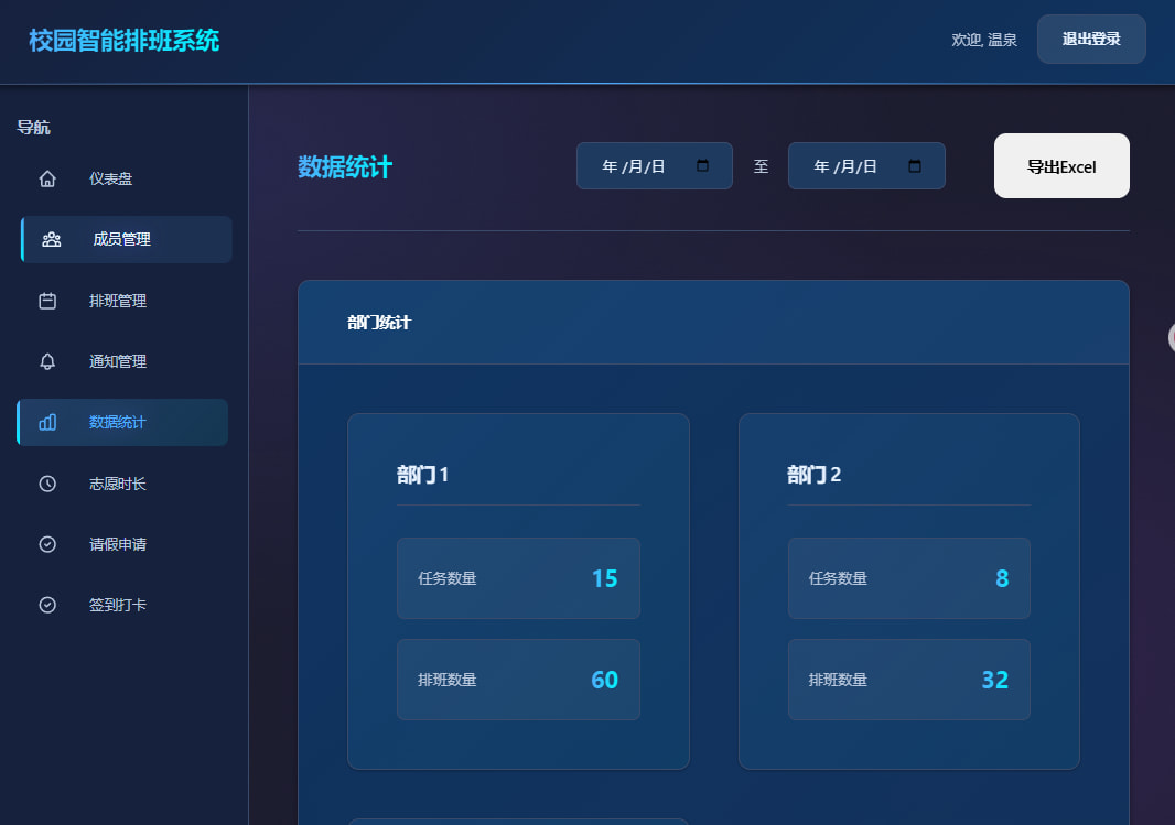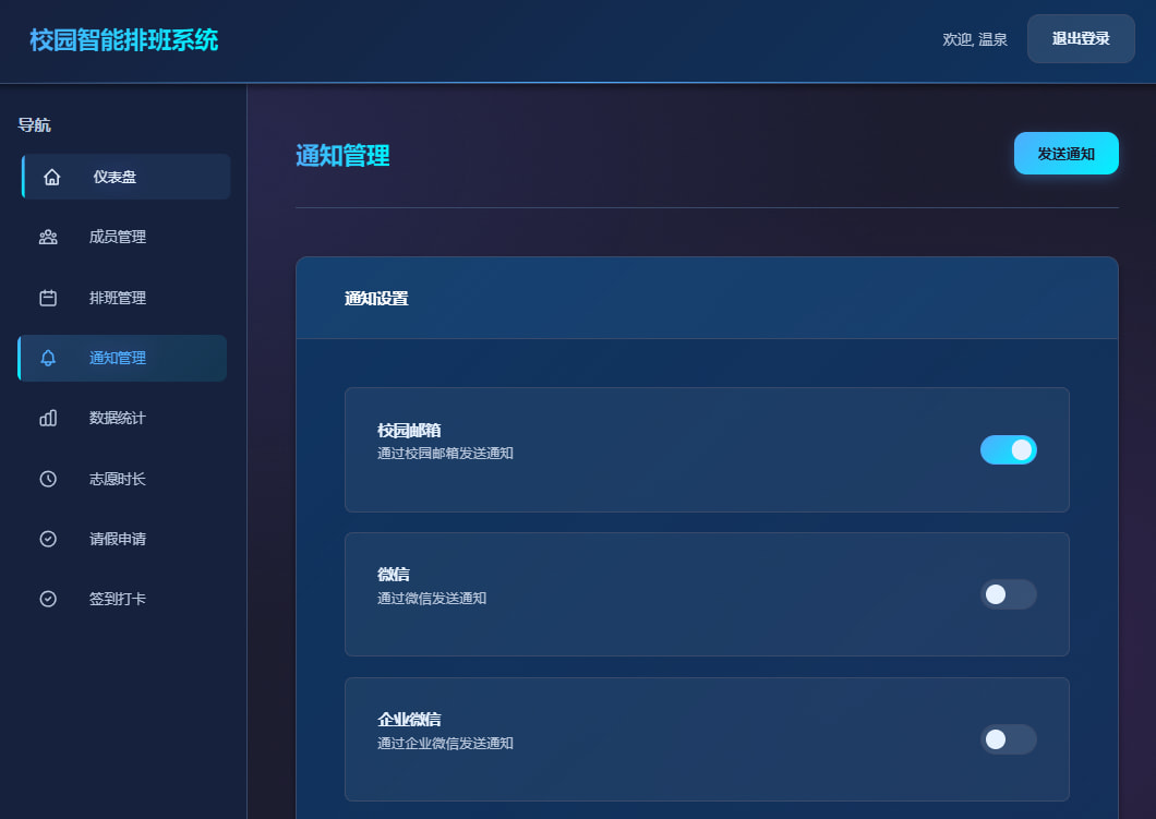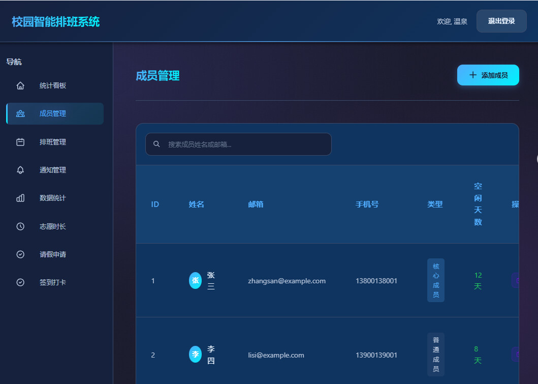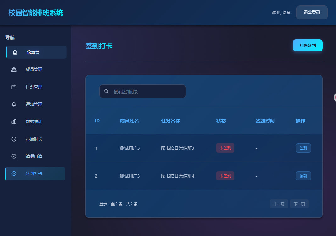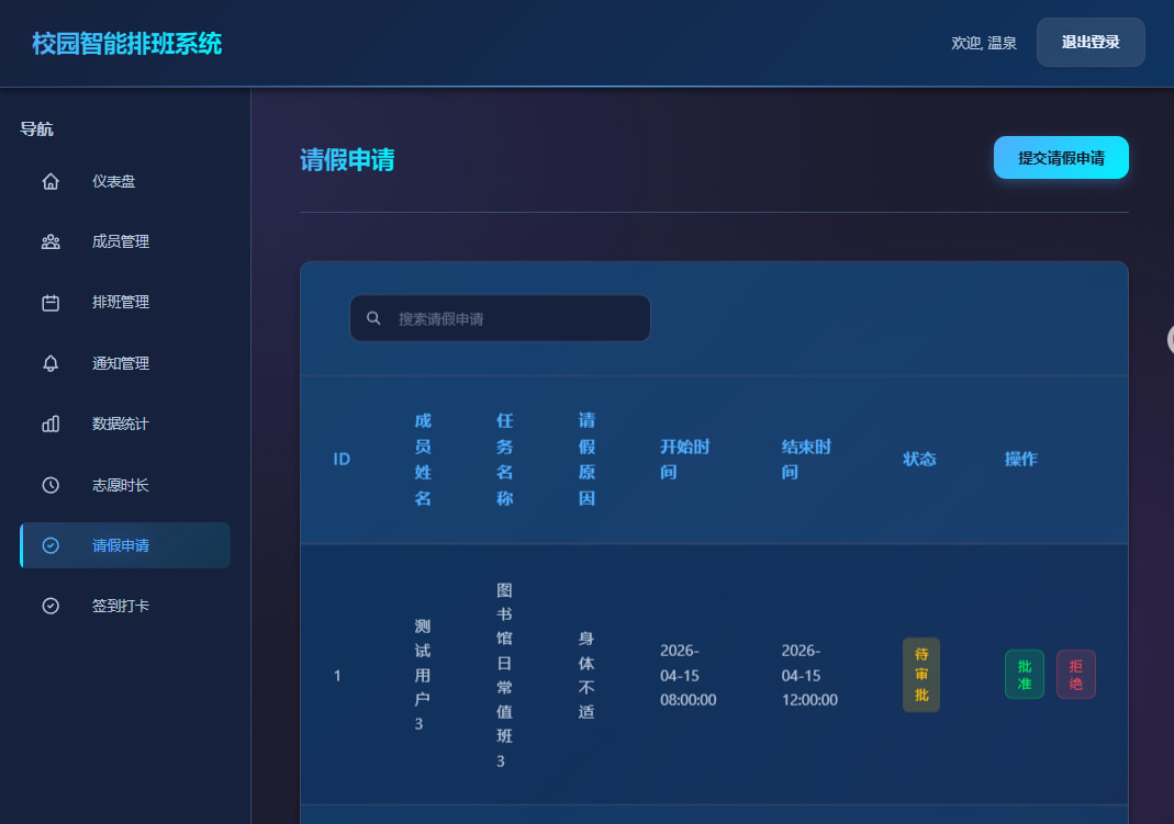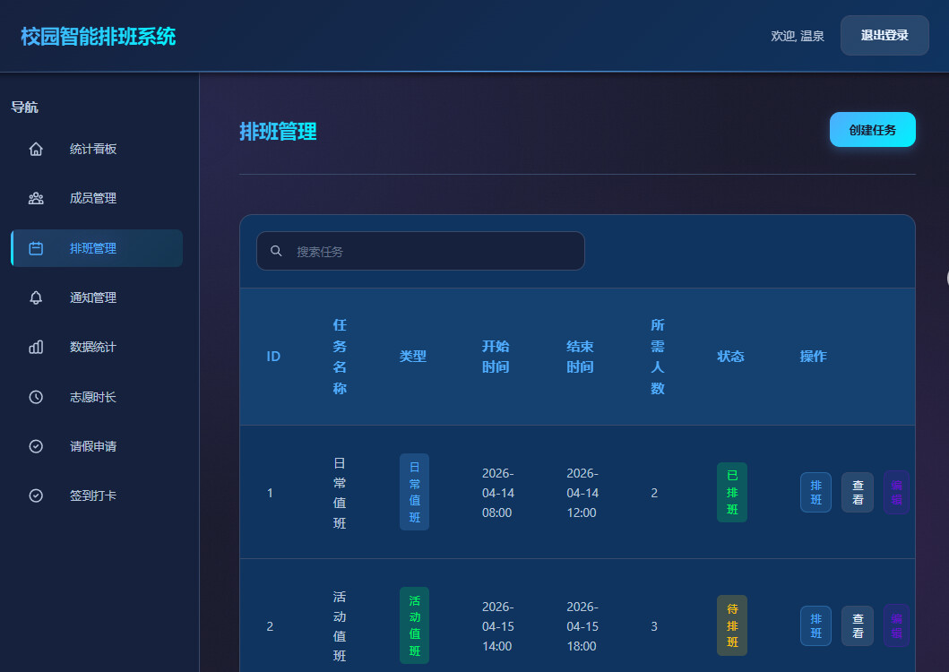使用 TRAE SOLO 快速构建了一个现代化的校园排班系统,实现了统一的深色主题设计、完整的功能模块和响应式布局。系统包含签到打卡、请假申请、通知管理等核心功能,界面美观和谐,操作流畅。