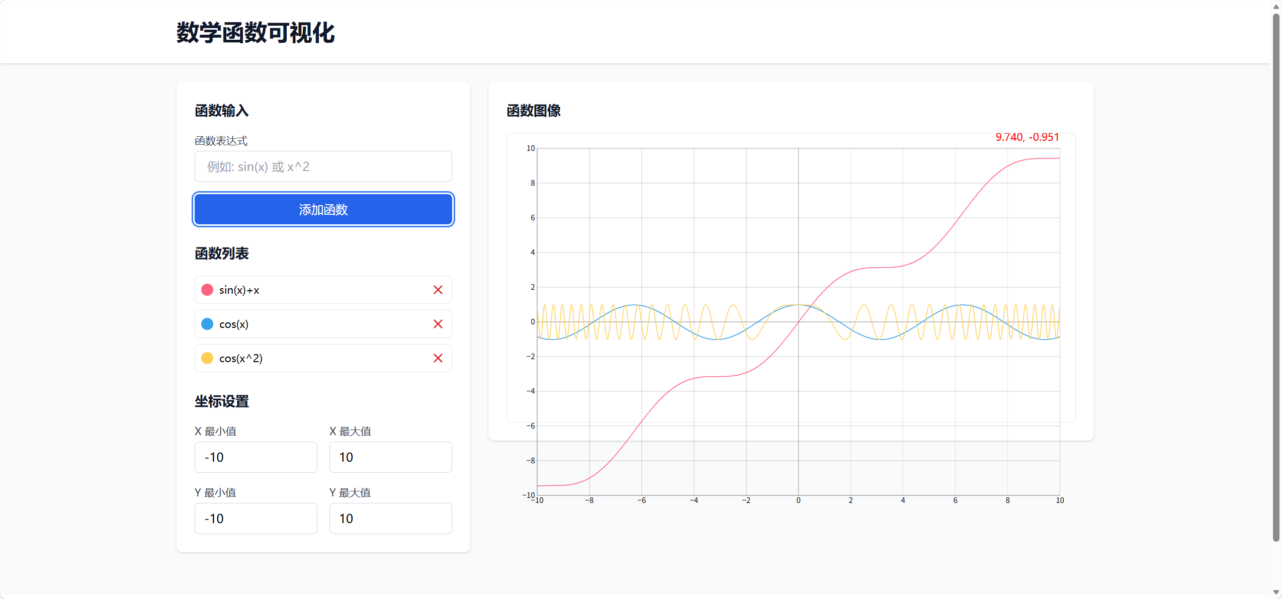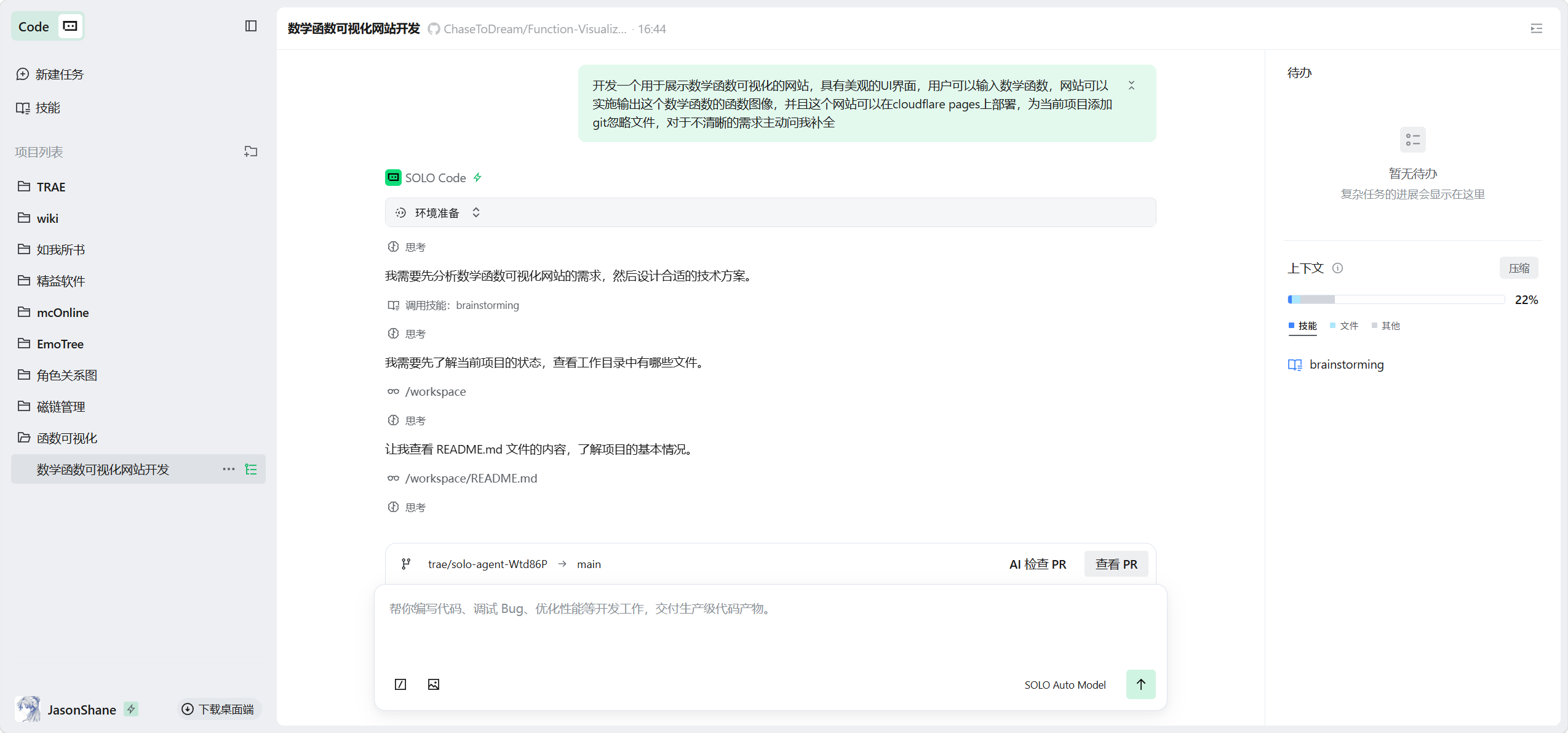 通过一句话需求,Code With SOLO全自动完成了一个纯前端的数学函数绘制网站,一键部署,支持绘制常见的函数图像(更多函数例如极坐标函数之类的需要二次开发)。