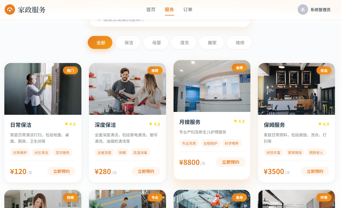 - 每个服务卡片显示:图片、名称、描述、价格、评分