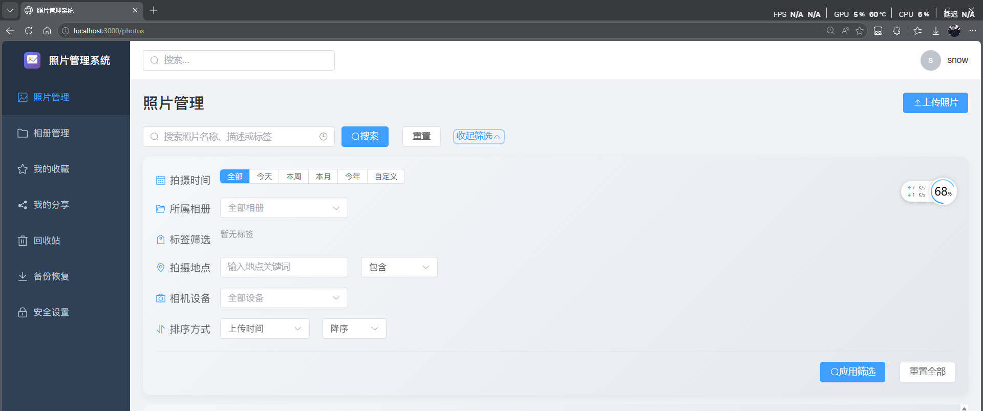 照片管理:瀑布流布局、时间线分组、批量操作、高级筛选(相机型号/GPS/尺寸/文件大小)
