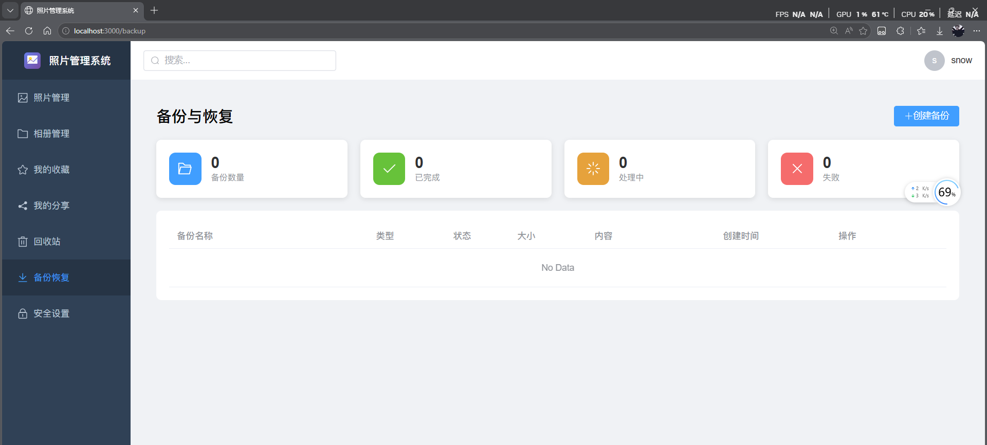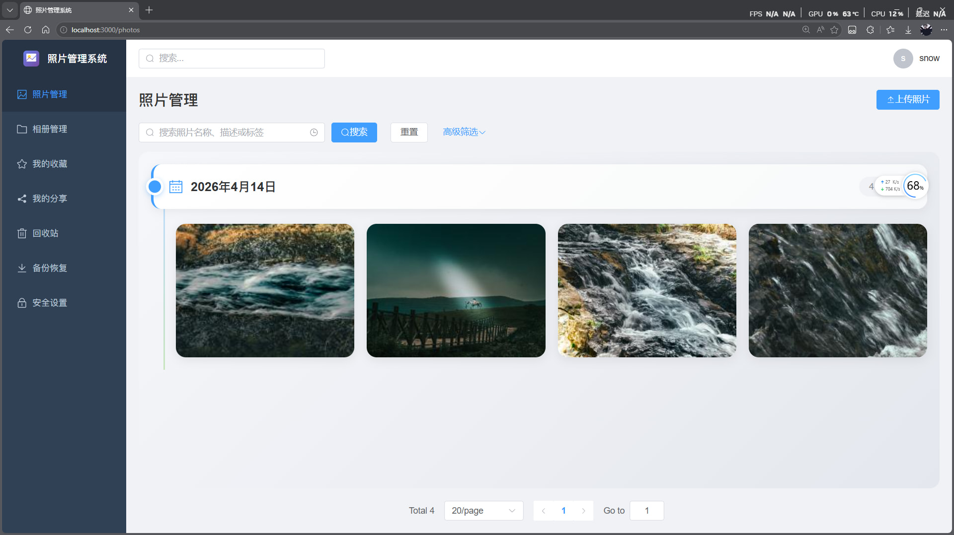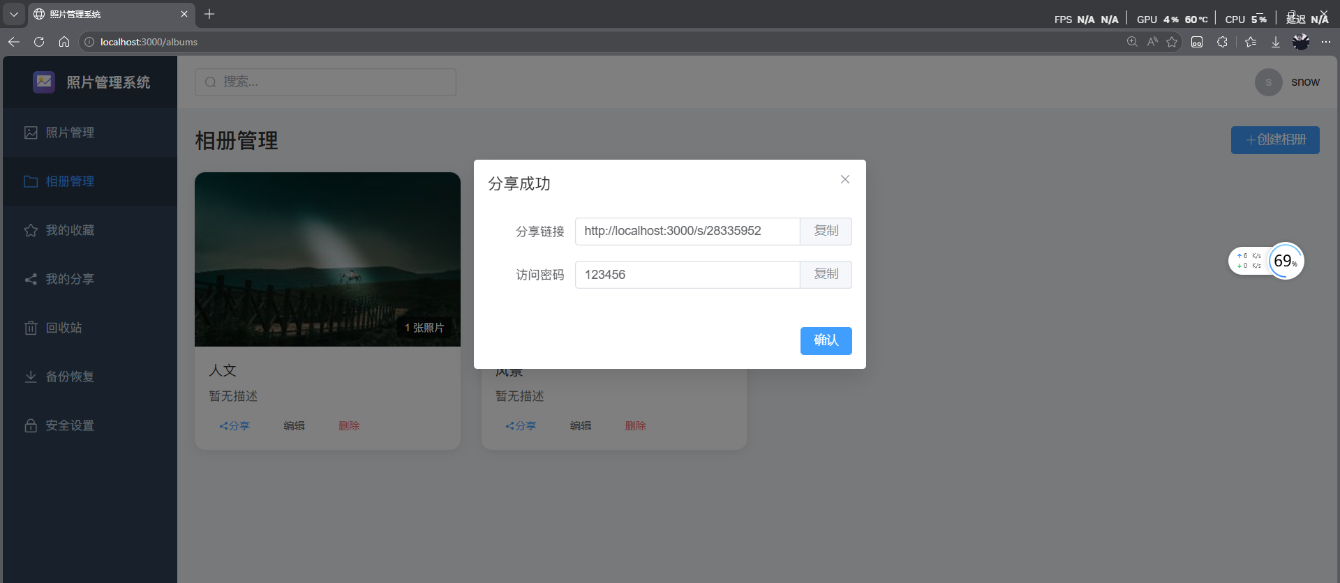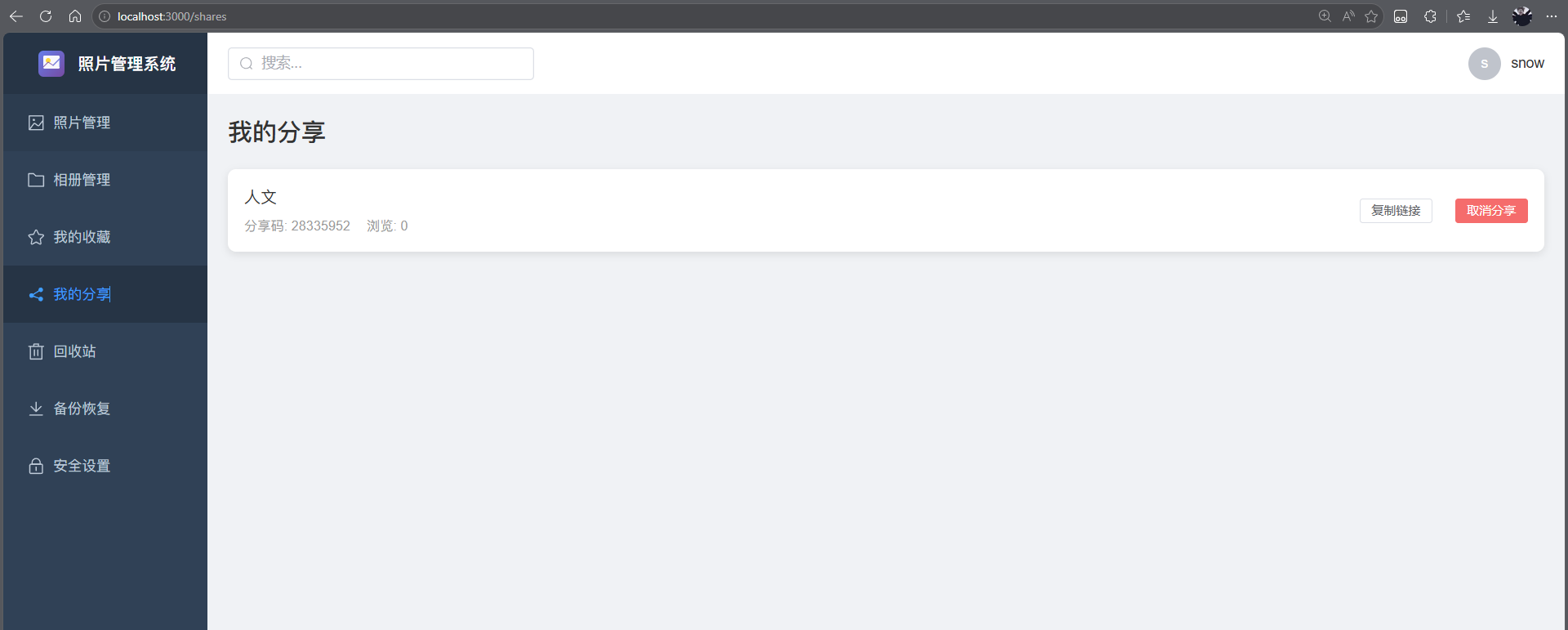 用户端 :支持照片上传、瀑布流浏览、相册管理(含封面自定义)、从相册移出/删除双操作、收藏标记、分享链接生成及密码保护照片。