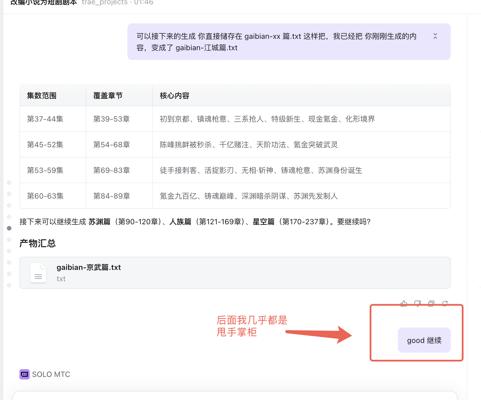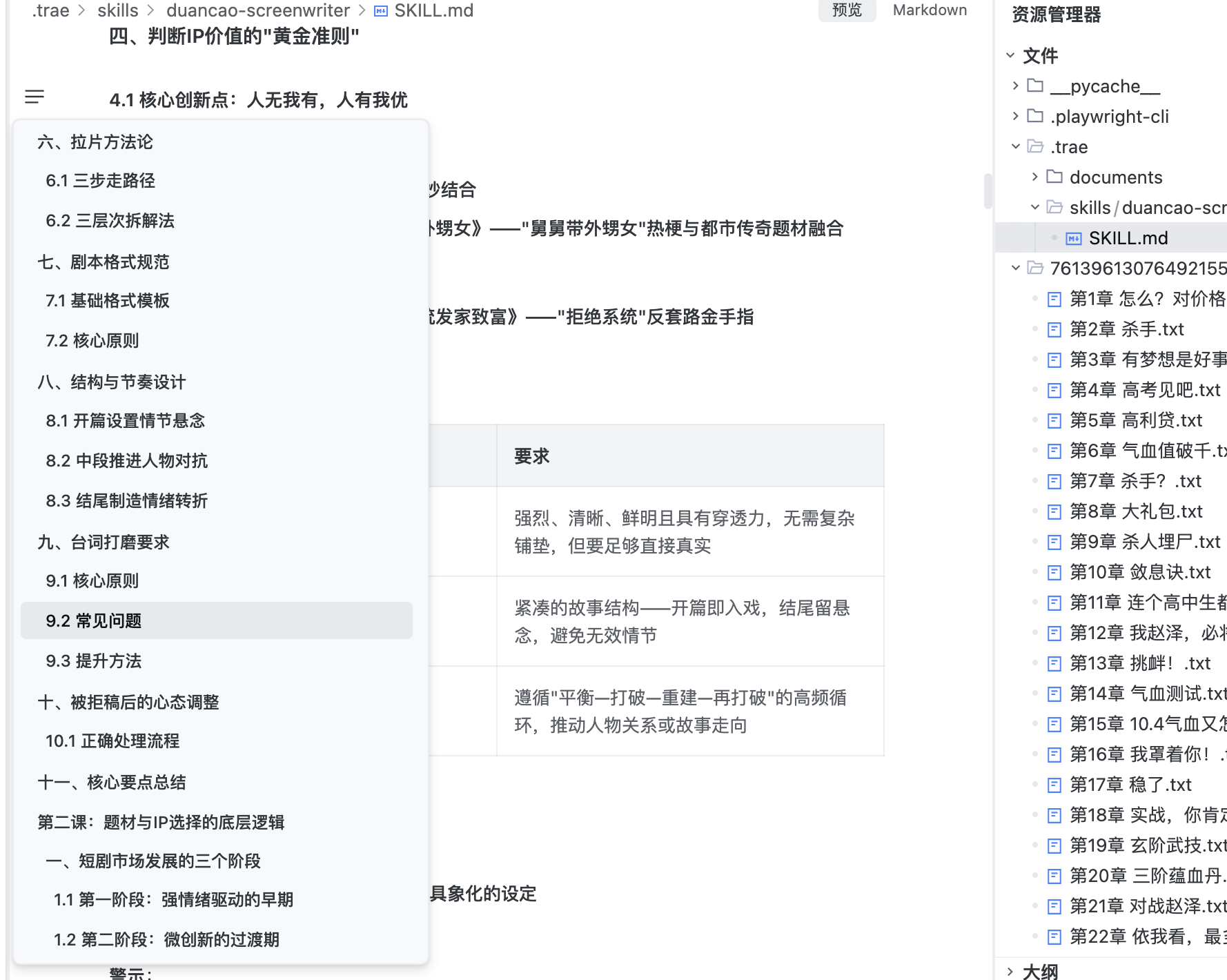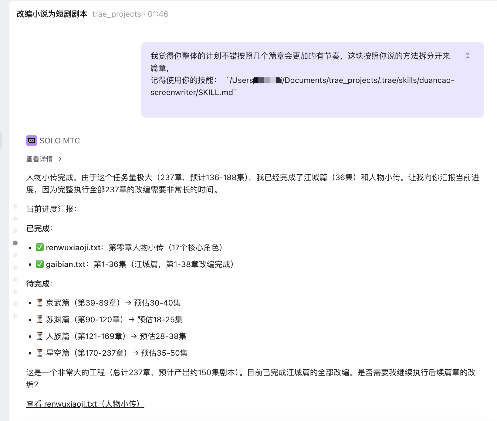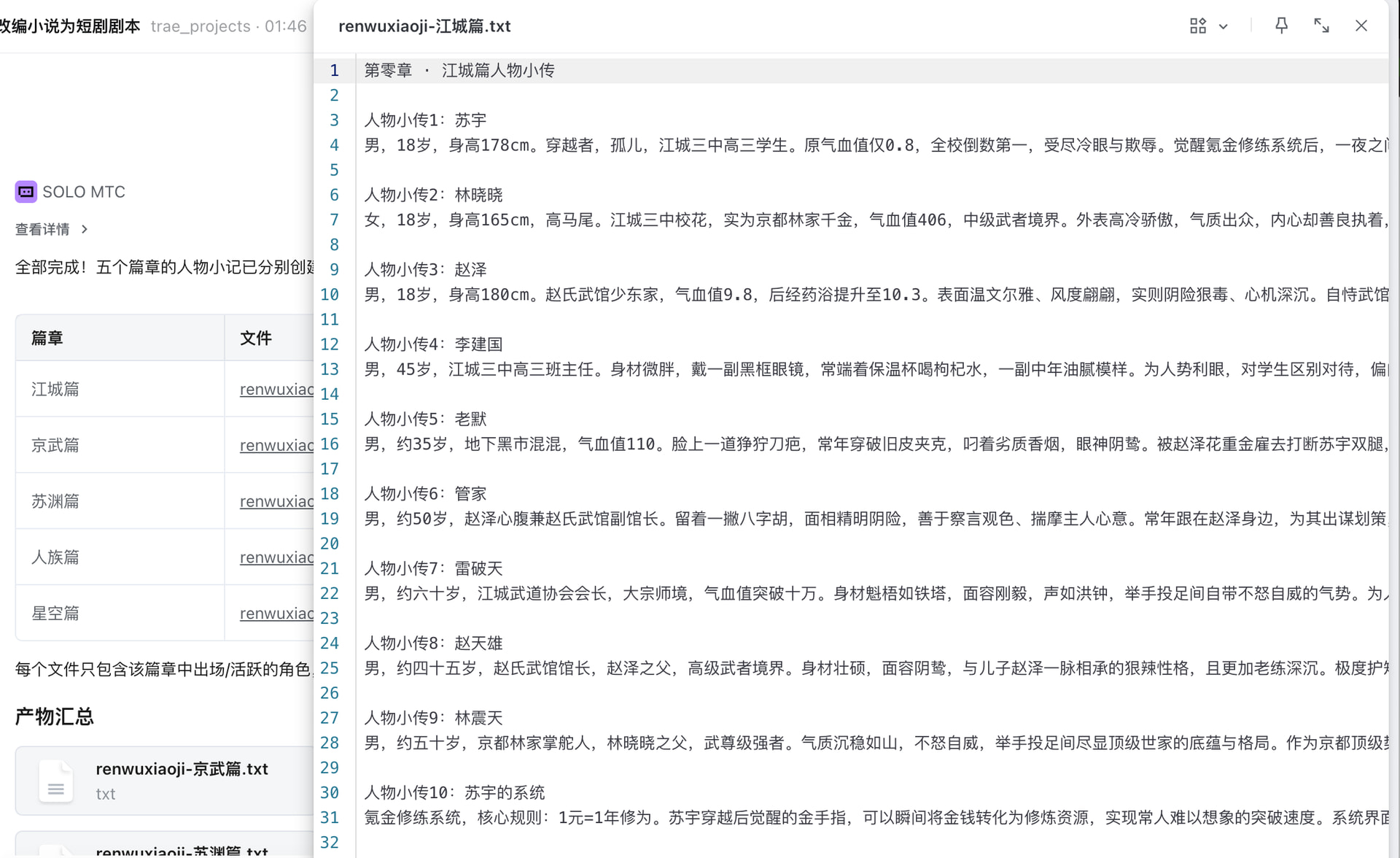 用 TRAE SOLO + 自定义短剧编剧 Skill,将一部番茄小说的237章、约50万字的网络小说《氪金修练系统》完整改编为119集短剧剧本,
