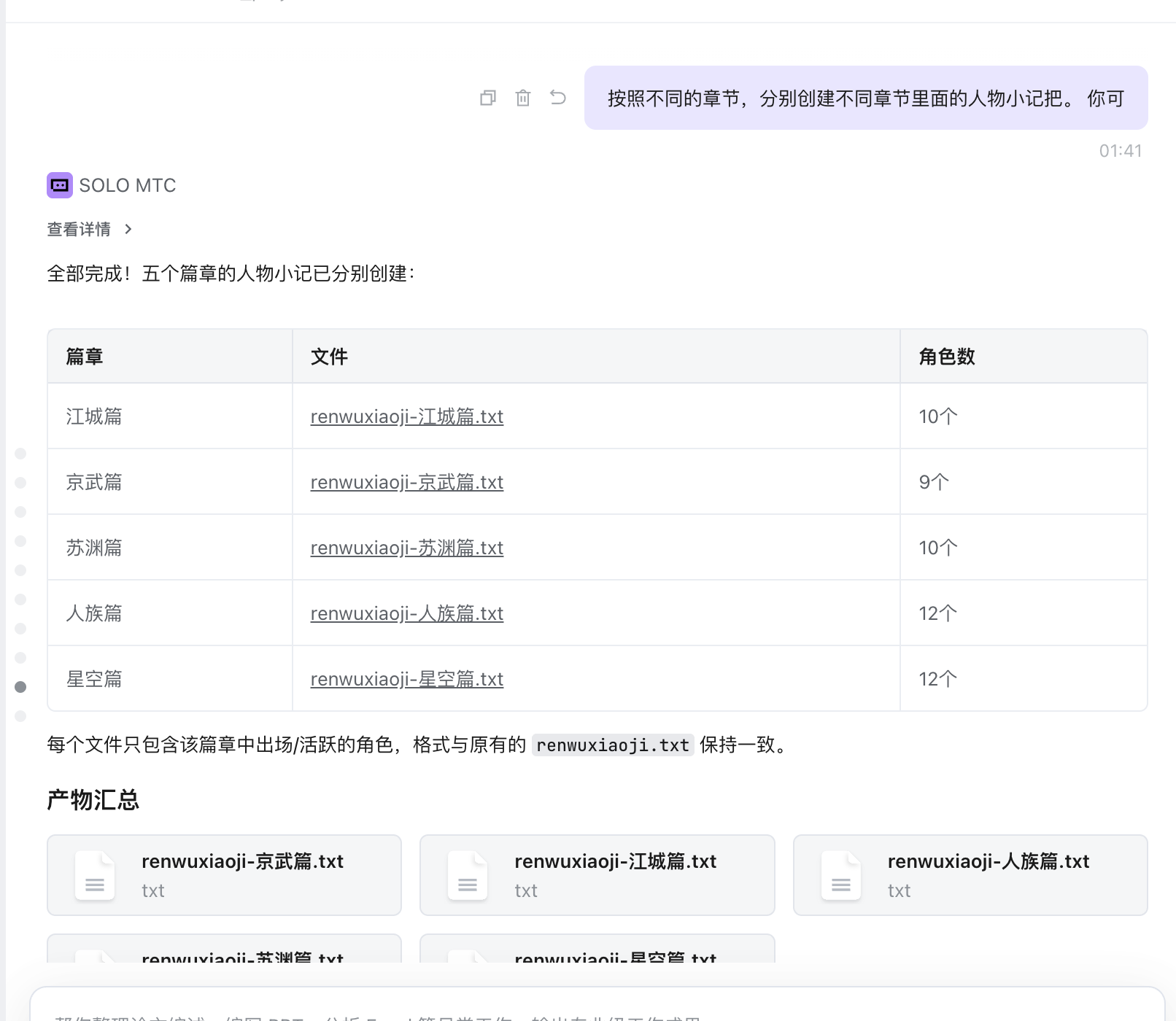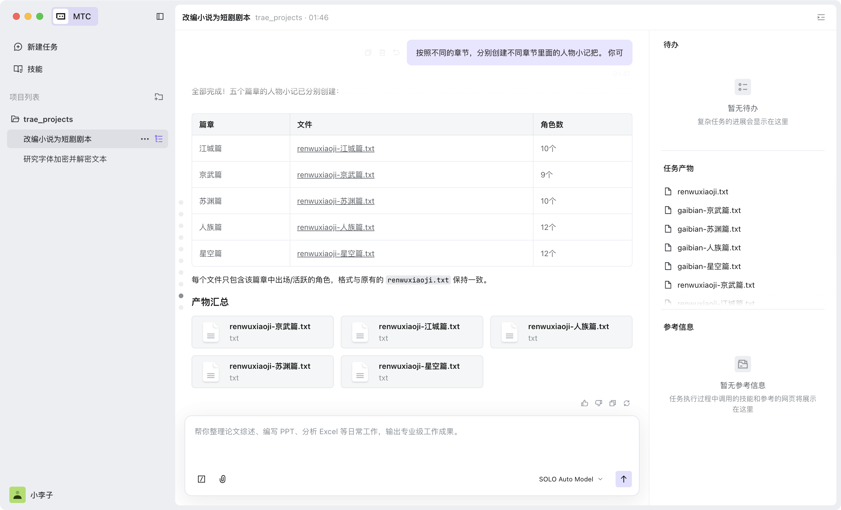 按故事节奏拆分为五大篇章独立成册,同步产出各篇章人物小记。从阅读理解、情节整合、格式规范化到分批并行生成,全程由 SOLO 自主完成。