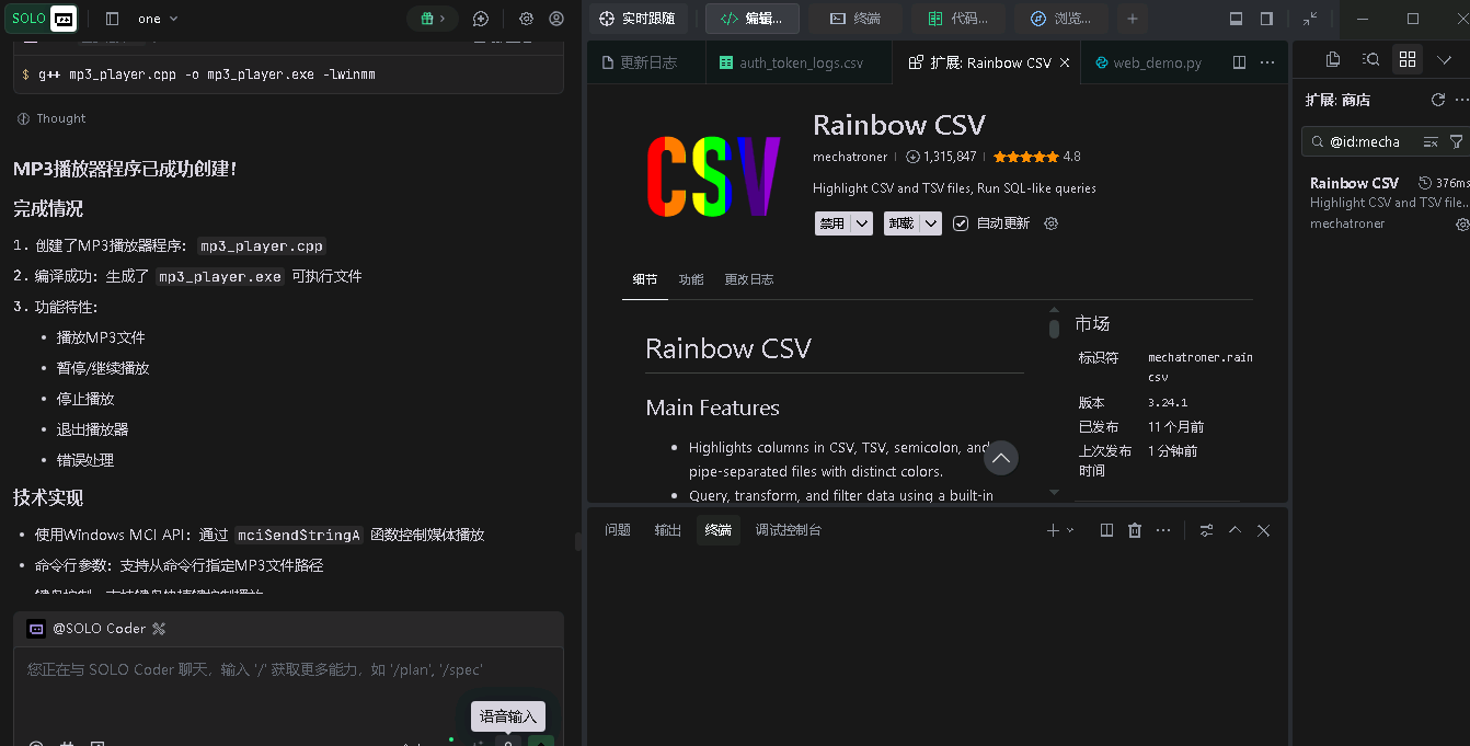 【Code-with-SOLO】TRAE SOLO生成MP3播放exe 1.摘要 用写一个MP3播放exe ,不用写一个代码 2.背景 抖音需要配音。 3.实践过程 直接创建的一个空白的文件,在文件里面给SOLO我的需求,SOLO就直接帮我生成小程序exe 4.展示