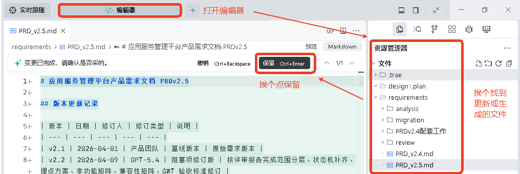 IDE模式下,一个任务完成后,所有更新或生成的文件会给出一个带审查文件列表,如下: