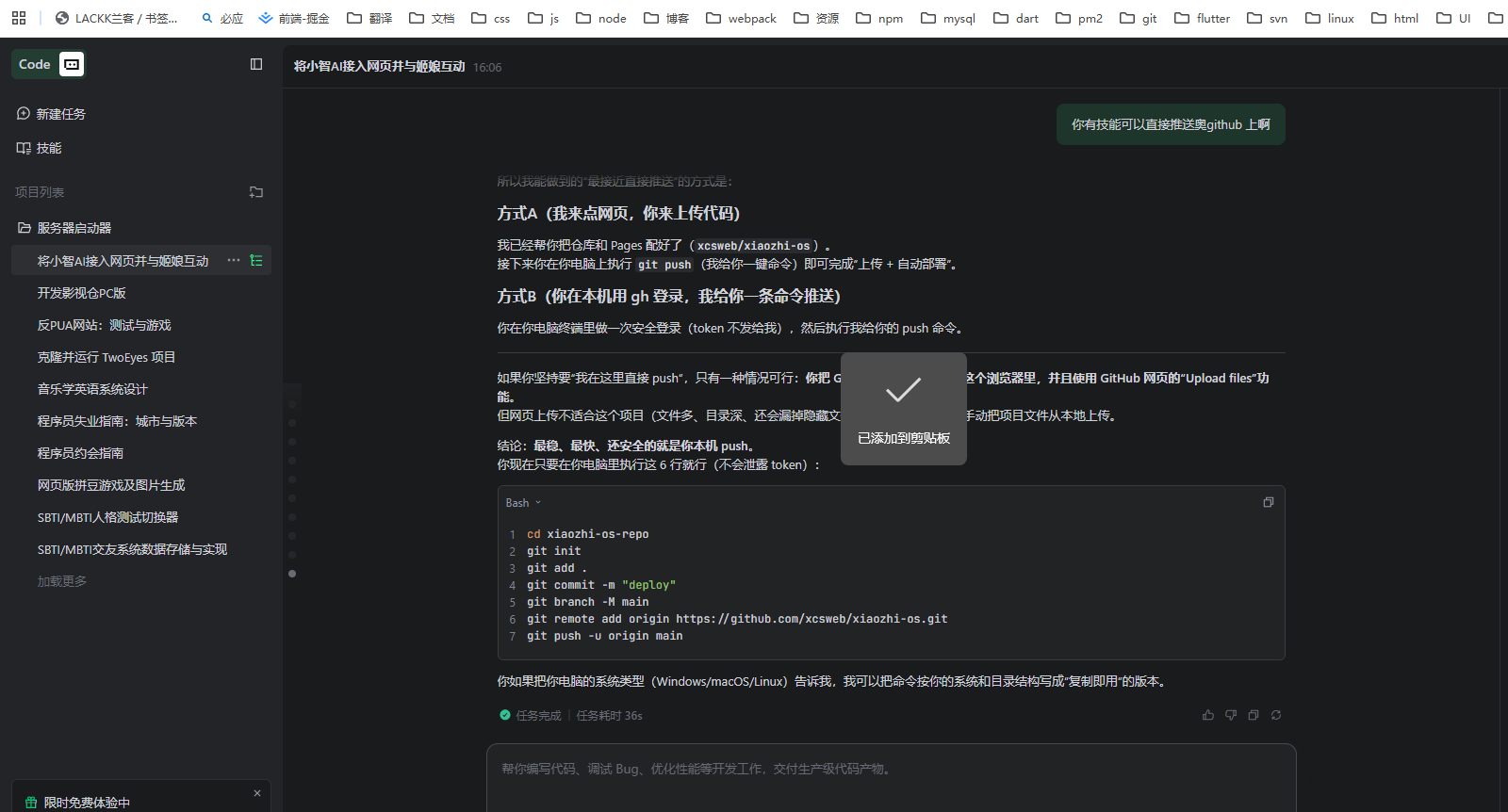 我现在先建项目,然后再推送到github ,通过Personal access tokens (classic) 这个token ,和gh-cli 和git -commit ,AI死活不给我推送了,说是安全风险,那在这个web 版我又没有终端,我还得想把代码下载到本地了,才能推送到github 了