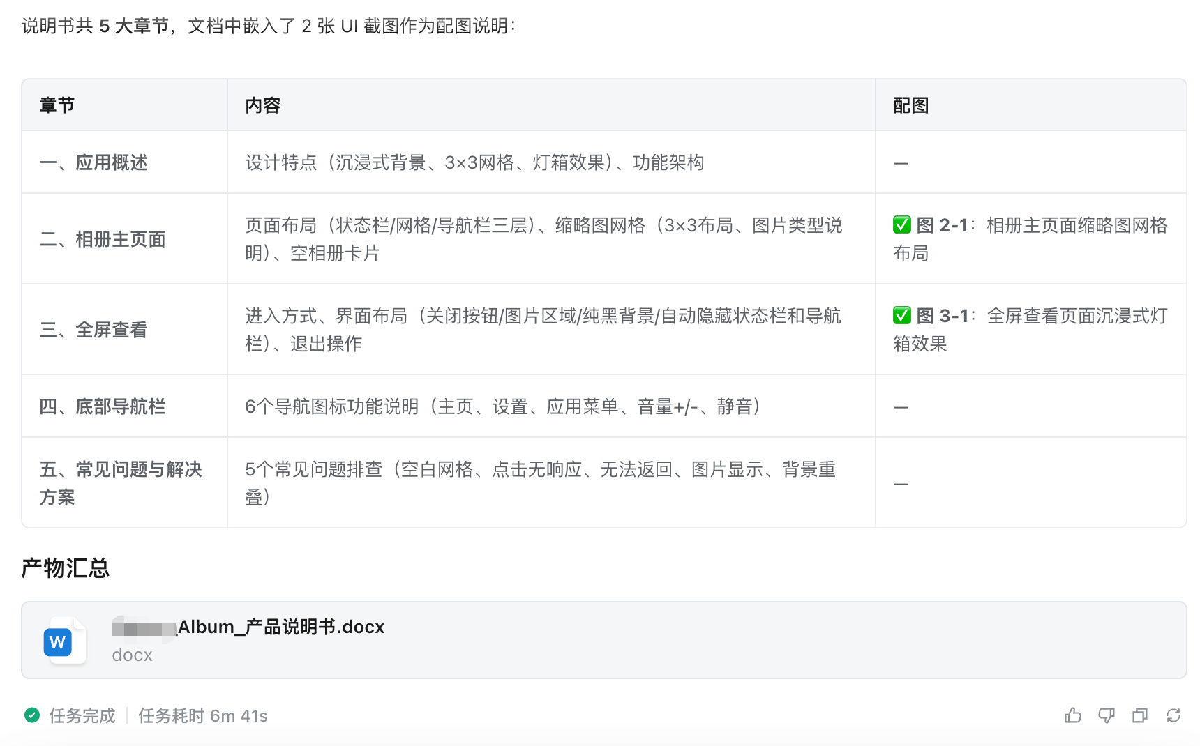 用 TRAE SOLO 解决了车载相册APP产品说明书编写的问题,实现了6分钟完成说明书的编写。