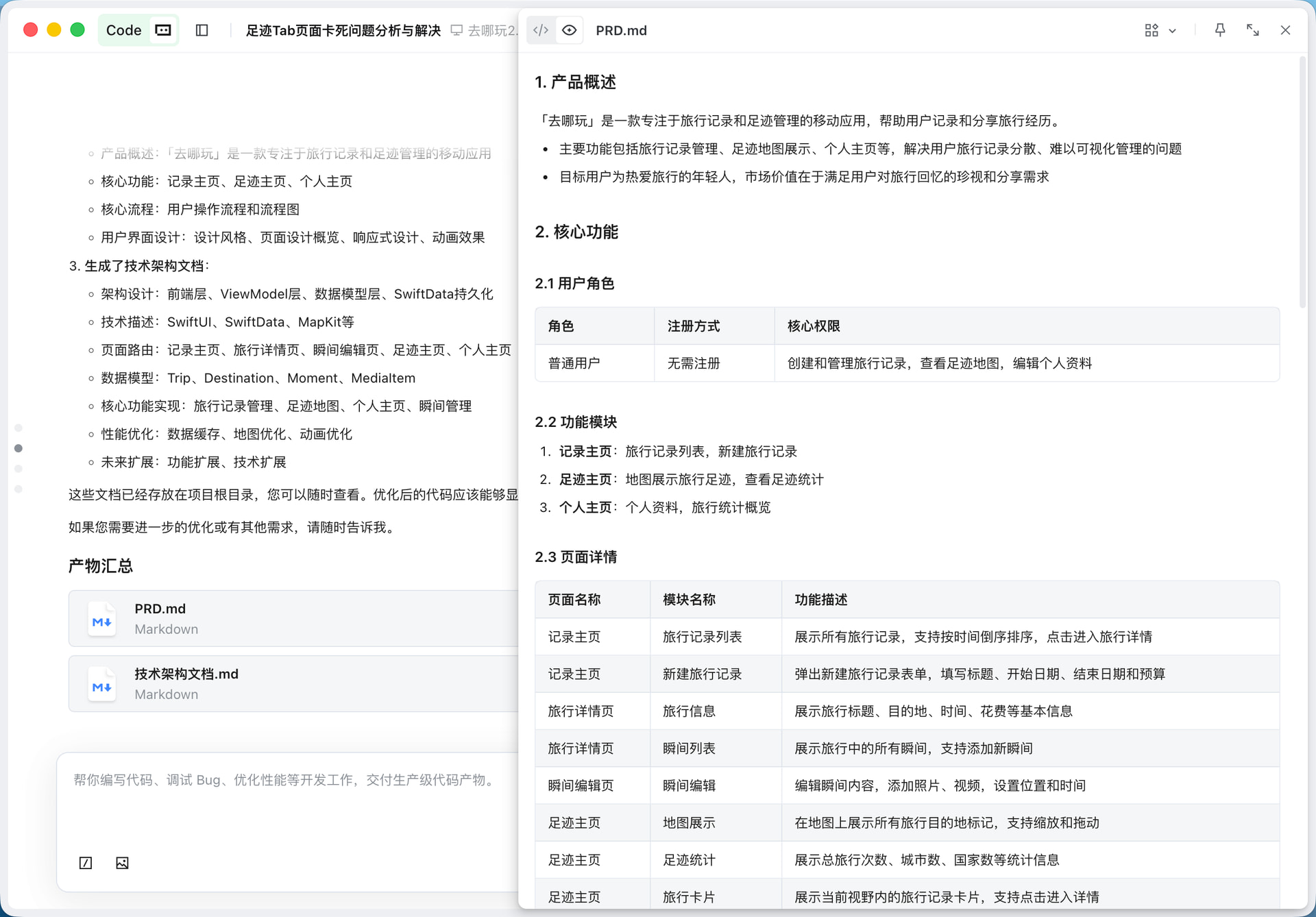 首先告诉TRAE:“帮我做个旅行记录 App”,然后坐等成品从天而降就好了。才怪!(开个玩笑哈哈哈,当然我真的觉得在不久的将来用户与应用的交互真的会简单到这个地步)