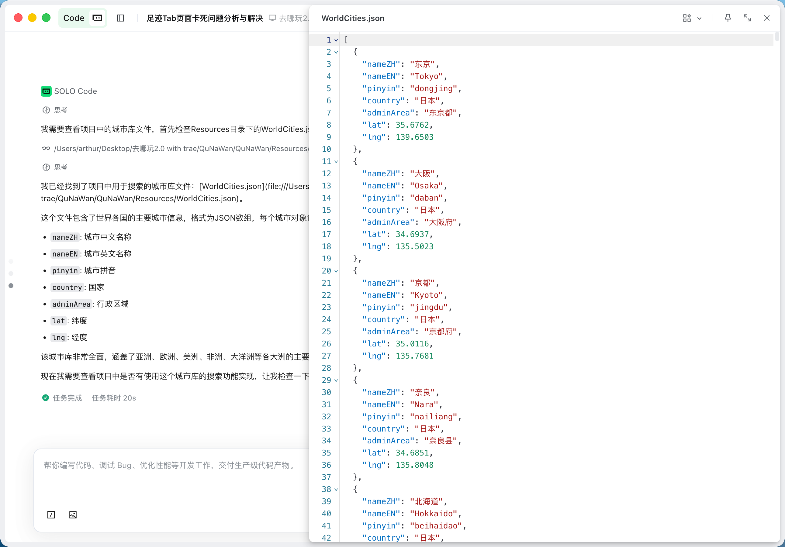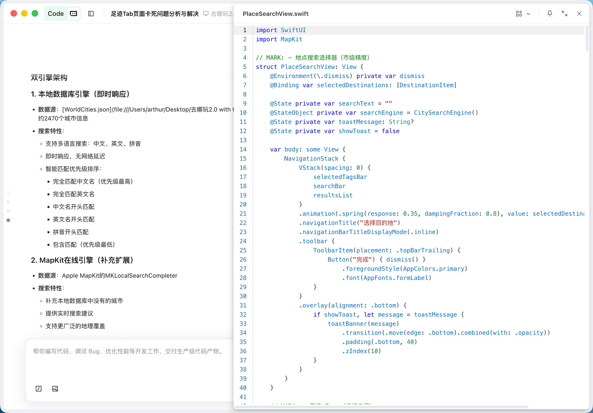 这是最经典的坑。我在测试中发现搜“东京”、“巴黎”,Apple Maps 在中国区死活搜不出来(后来知道时 API 限制)。TRAE 再试了几次以后没有硬扛,而是提出了一个"双引擎"方案:自己手撸了一个内置 360+ 全球热门城市的本地词库(中英文 + 拼音全支持),作为主搜索引擎;苹果原生搜索作为补充引擎,专门兜底国内地址,同时还加了 POI 去噪优化搜索结果。