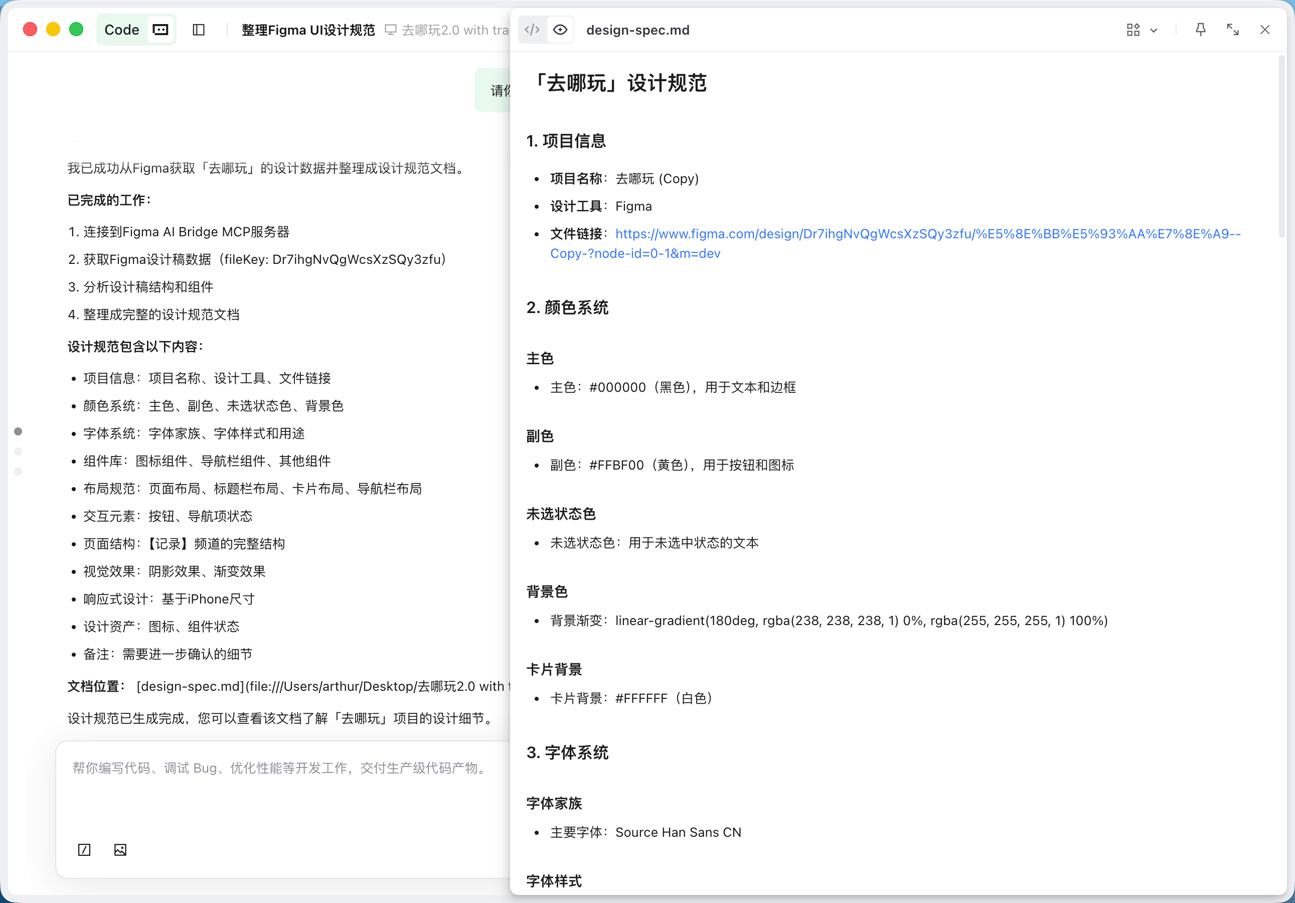 不得不说 TRAE 的 MCP 真的巨好用巨丝滑,连接没出现任何报错一次搞定,amazing。我把 Figma 设计稿通过 MCP 工具接给 TRAE ,它直接读取节点参数——色值、字号、间距、圆角、阴影,精确到像素级别。自动给我生成了一套完整的 SwiftUI 设计令牌(AppColors、AppFonts、AppStyles),后面所有页面都从这套令牌长出来的。
