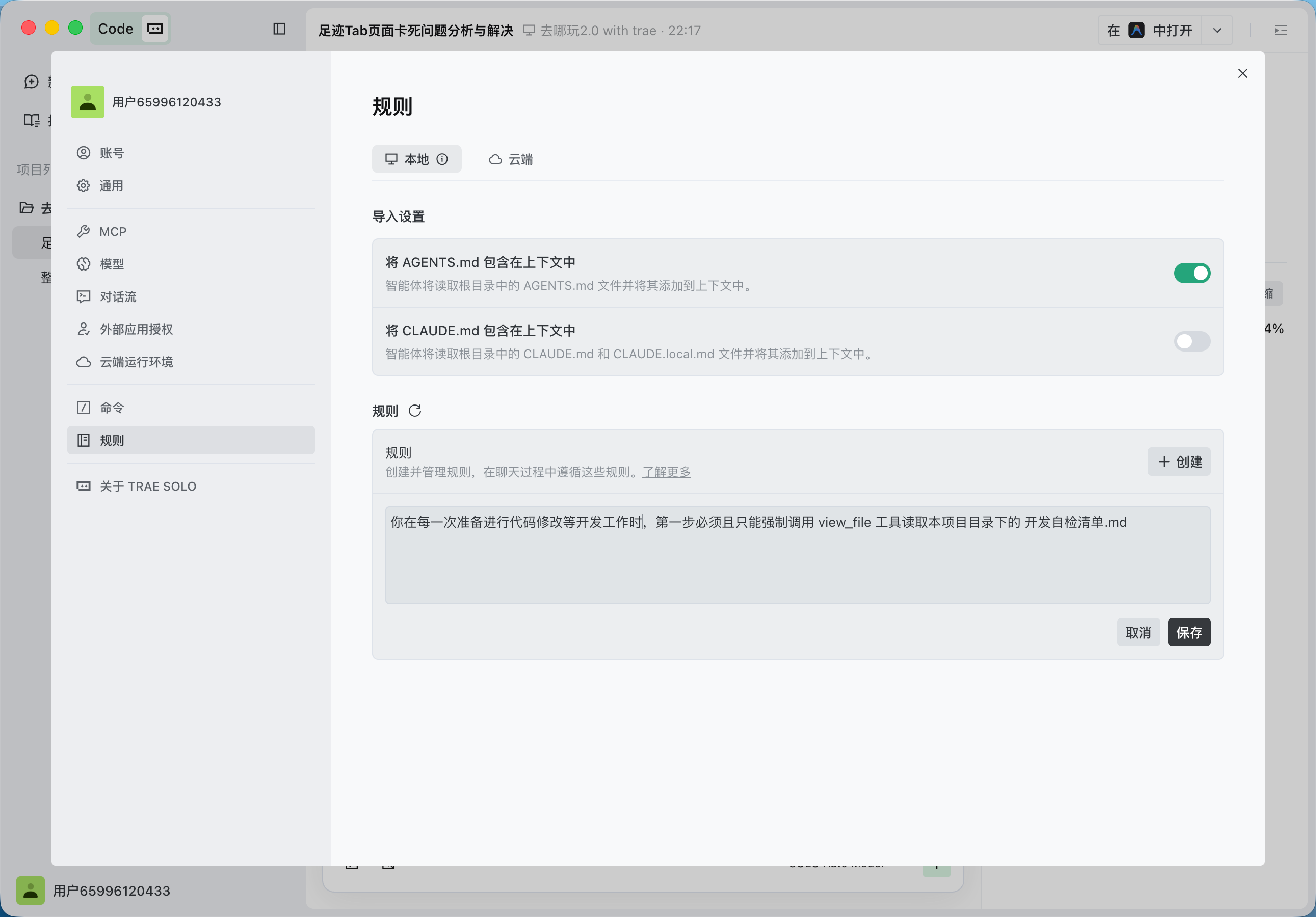 另外我还干了一件事——跟 TRAE 一起写了份《开发自检清单》,6 条铁律,每次对话它必须先读一遍。比如