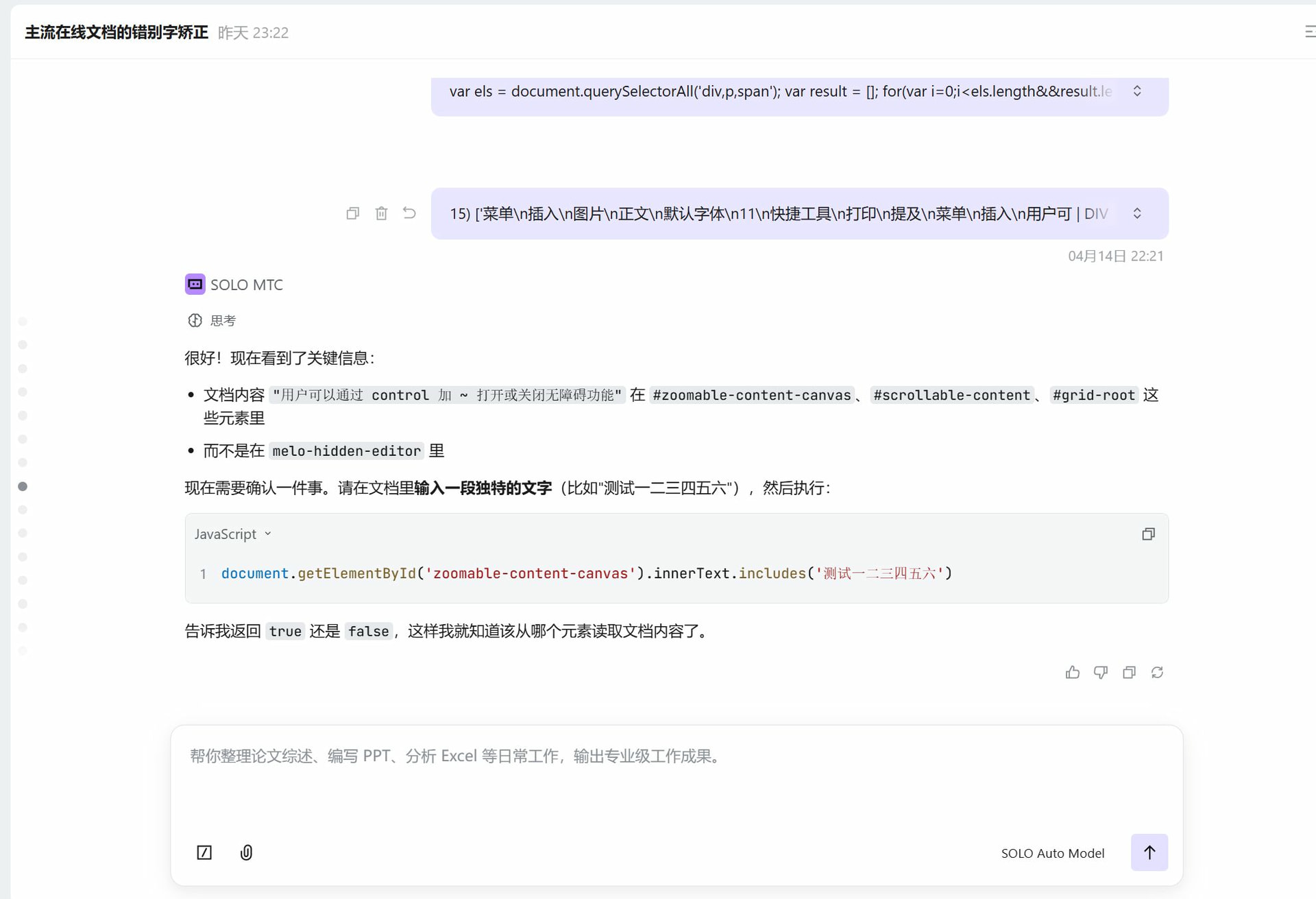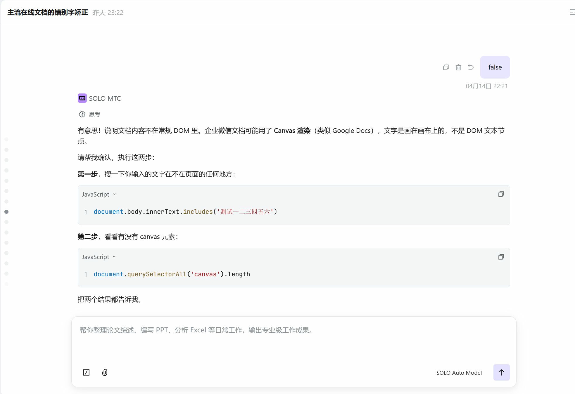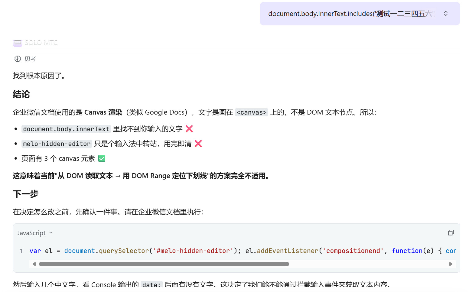 这一步的感受: 如果没有 SOLO 帮我在企业微信文档里一步步排查 DOM 结构(执行 querySelector、检查 innerText、分析 canvas),我自己可能要花一整天才能定位到 Canvas 渲染这个问题。