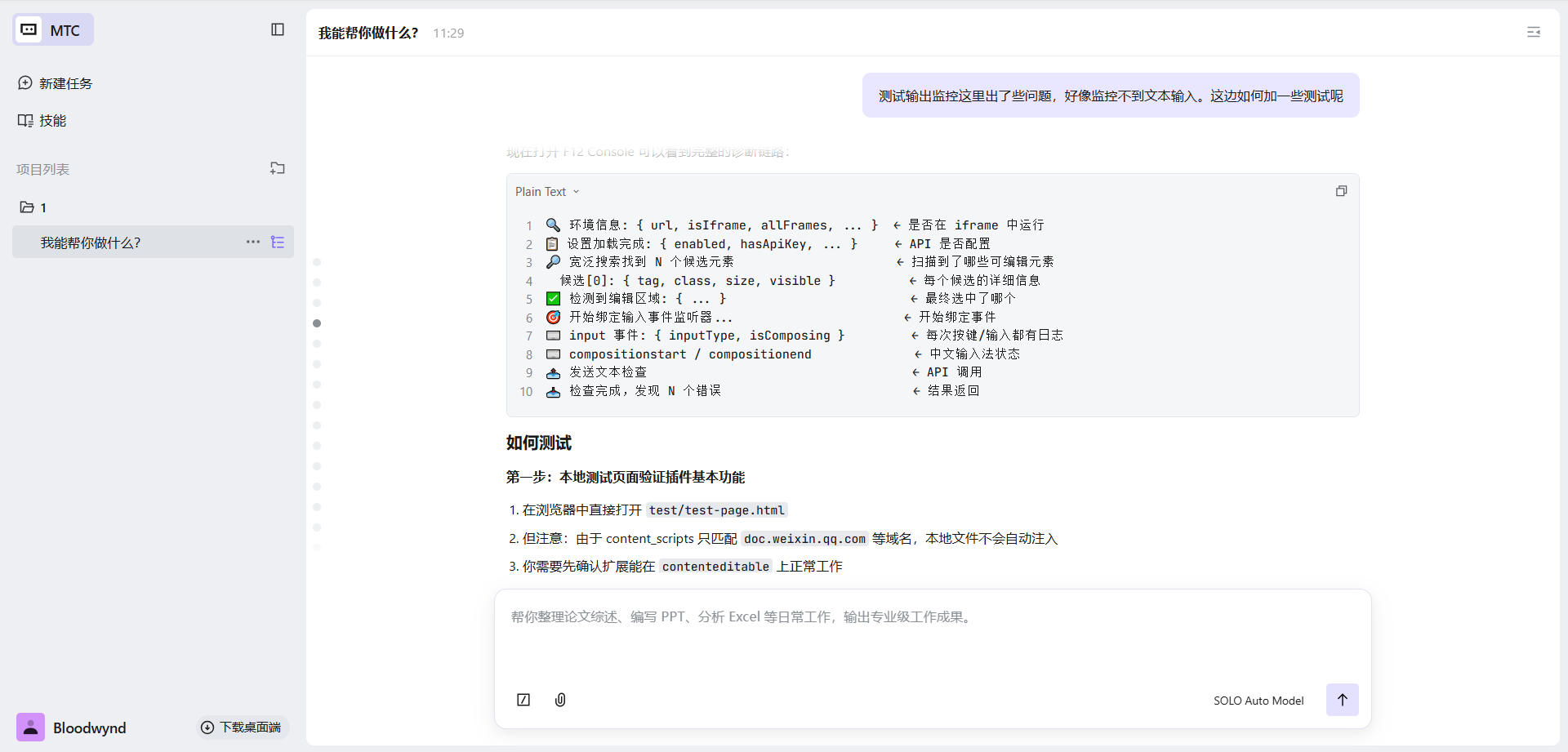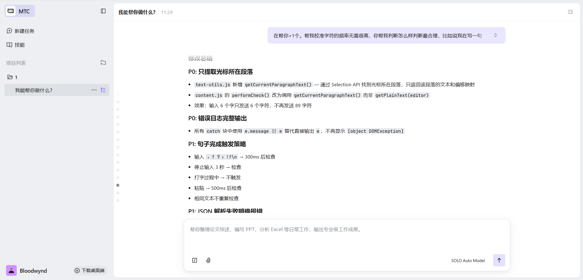 我最开始的需求就是"做一个错别字检测的功能",非常模糊。但没关系,SOLO 先帮我搭了一个能跑的版本,然后我在实际测试中发现问题,再逐步提需求优化。
