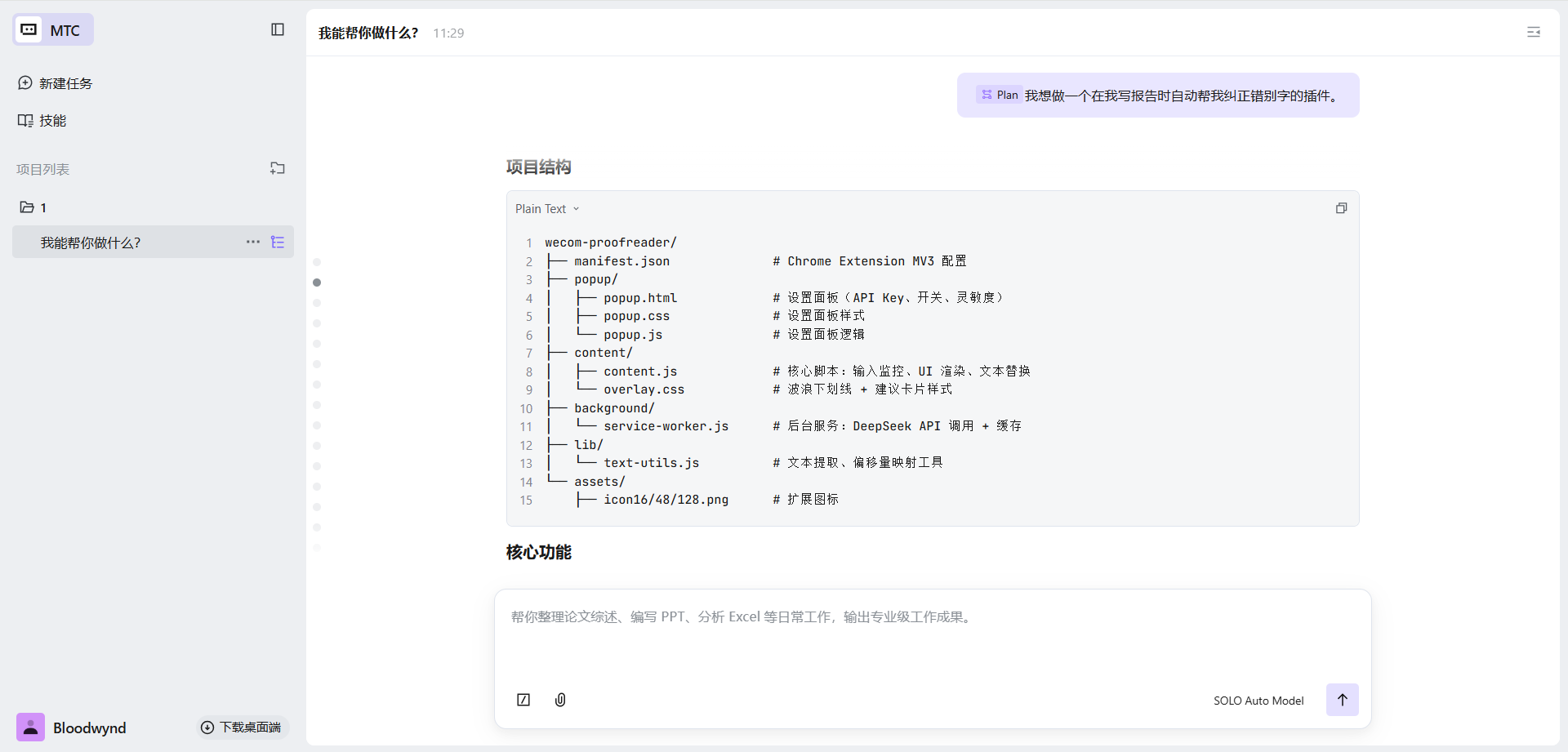 我对 SOLO 说: 帮我想做一个在我写报告时自动帮我纠正错别字的插件。