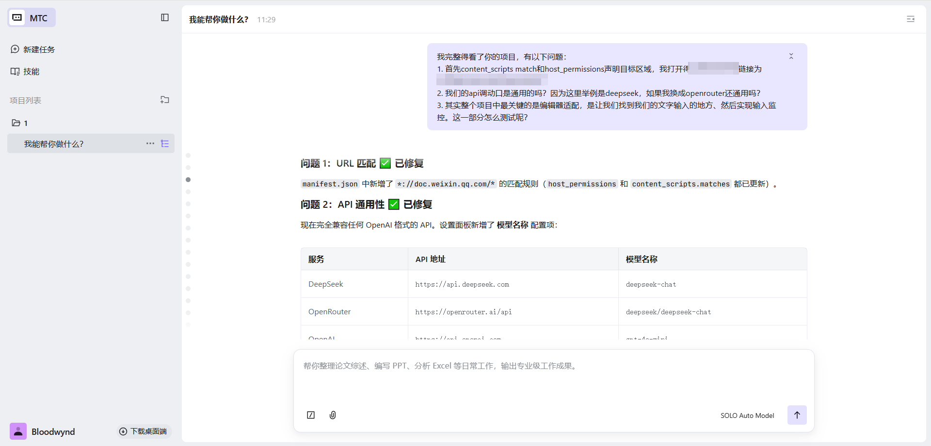 项目搭好了,但真正的挑战才刚开始。为了让自己能更加清晰的判断,我简单读了下整个项目,并发出了一些疑问,大模型得API调用功能是否多平台通用(OpenAI/Deepseek/Openrouter)?编辑器找不到?等。