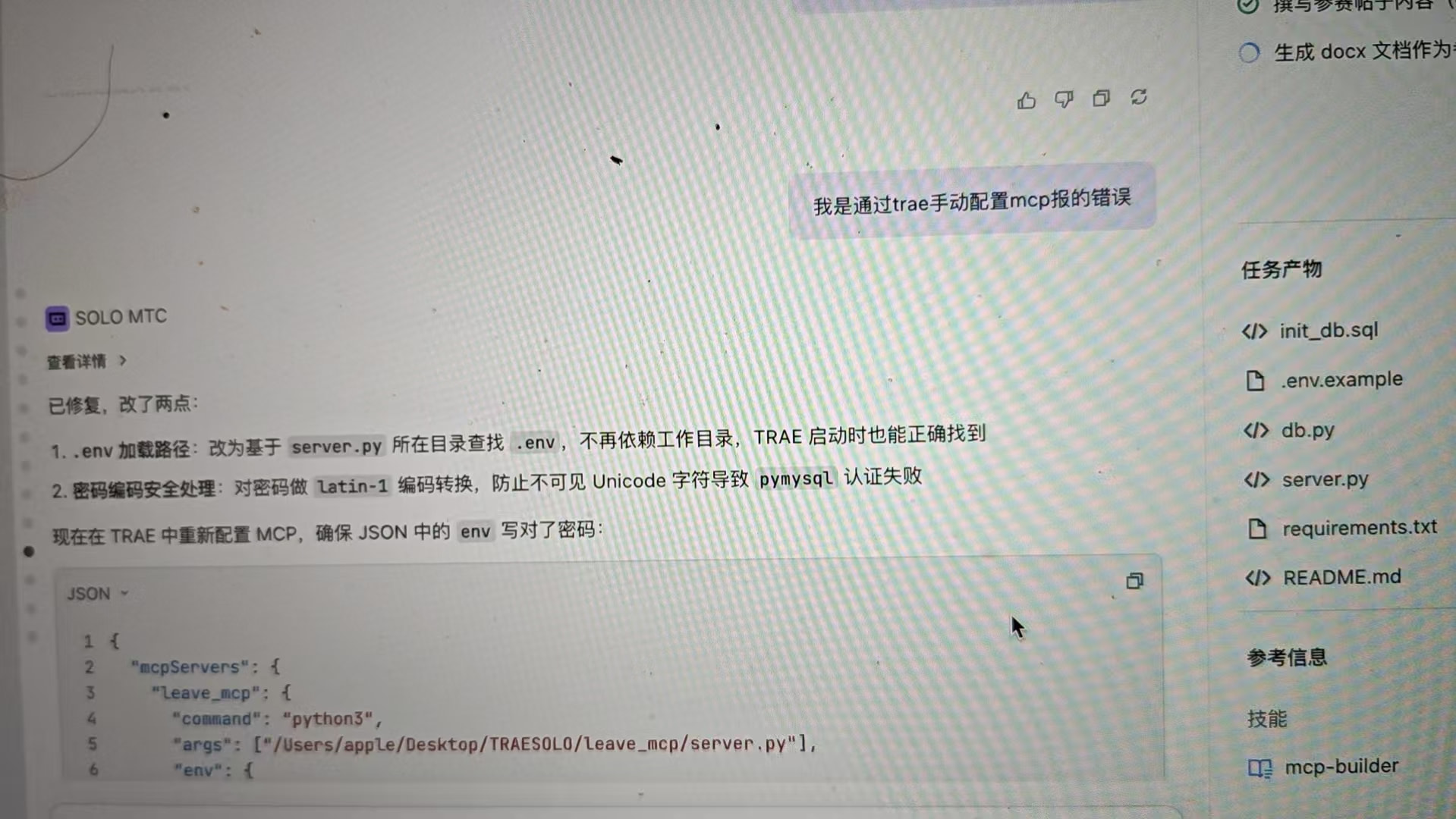 SOLO 自动生成了完整的项目代码,包括 SQL 建表脚本、数据库连接层、MCP 服务器主文件、环境配置模板和 README 文档。