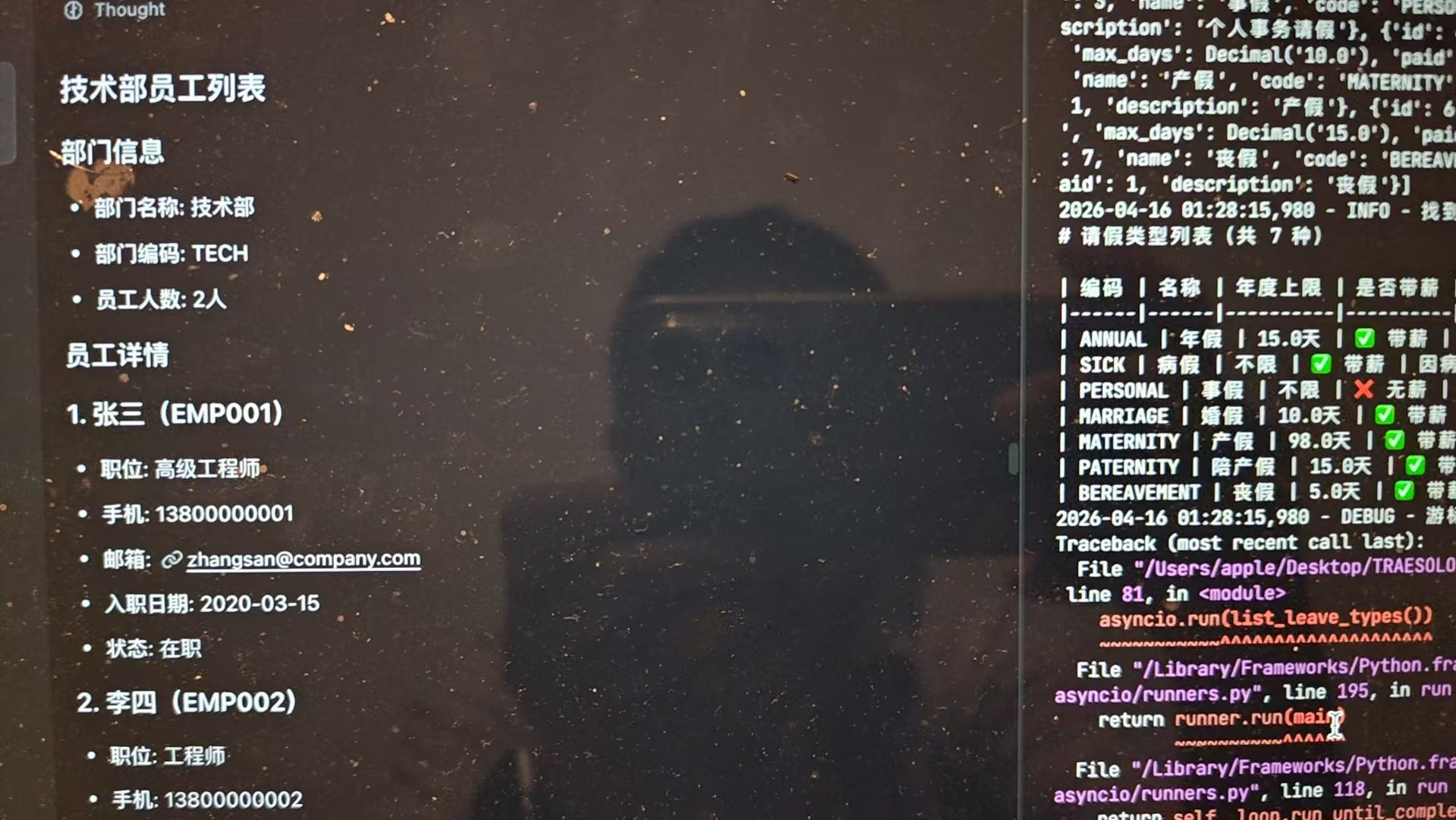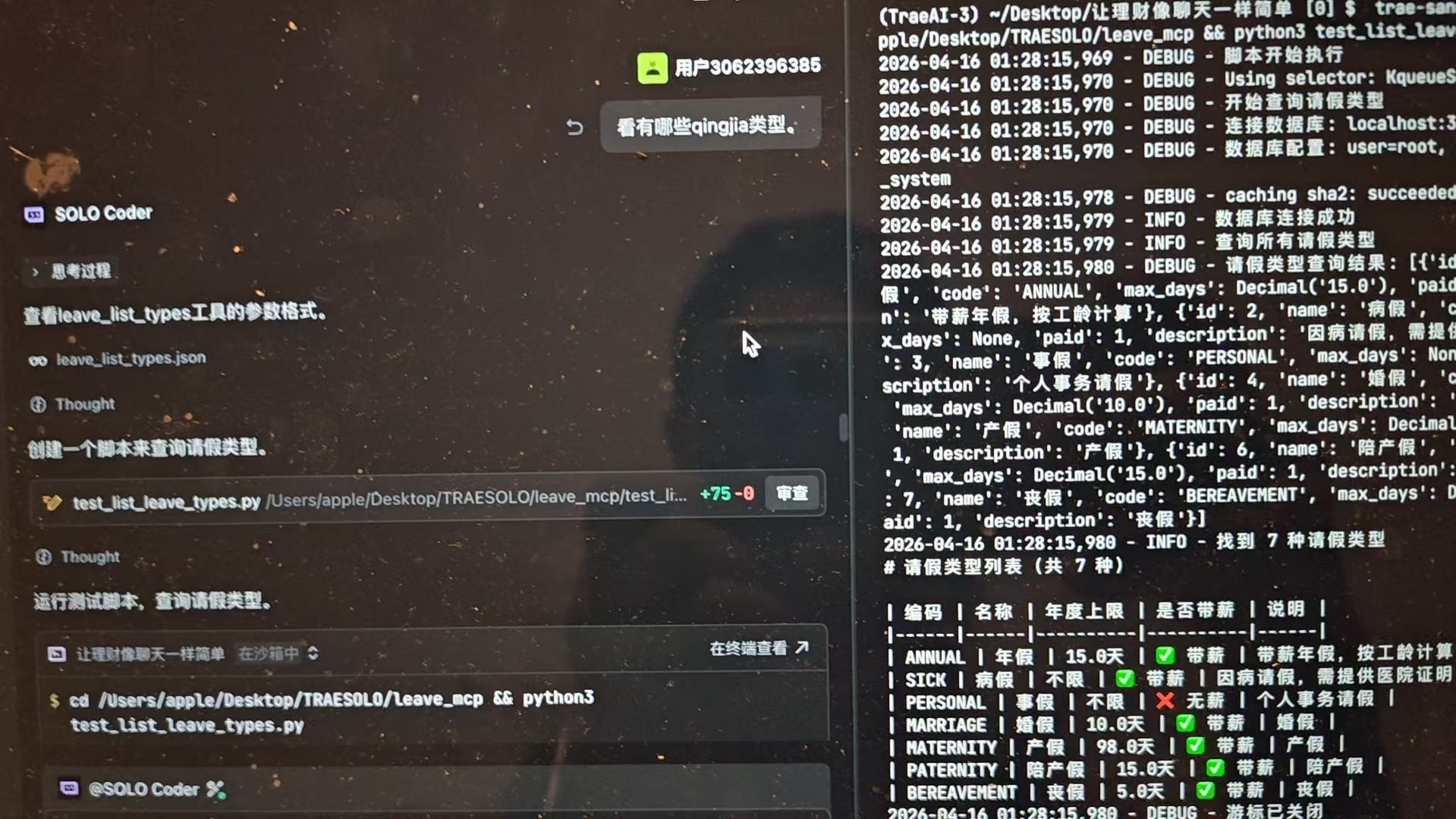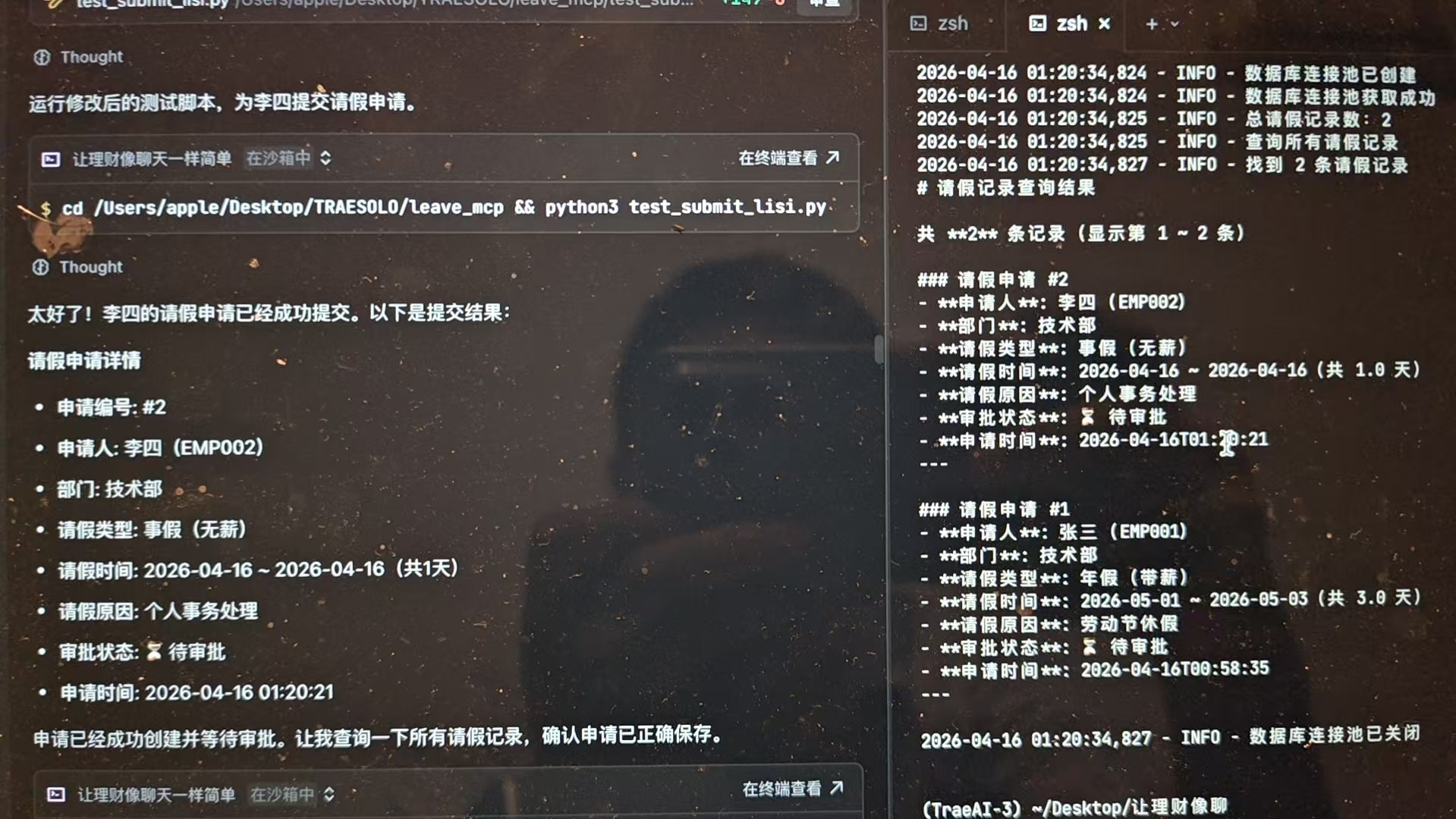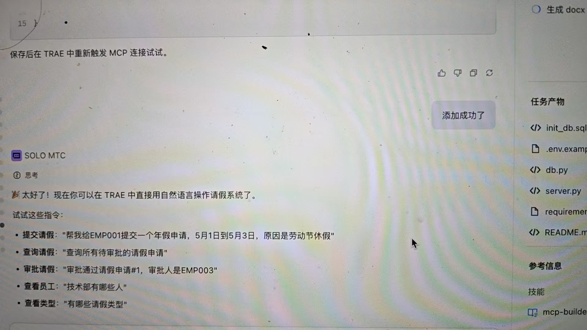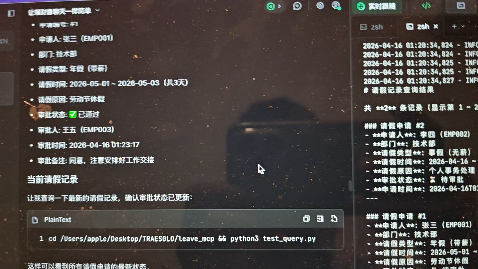 项目完成后,可以直接在 TRAE 中用自然语言操作请假系统: