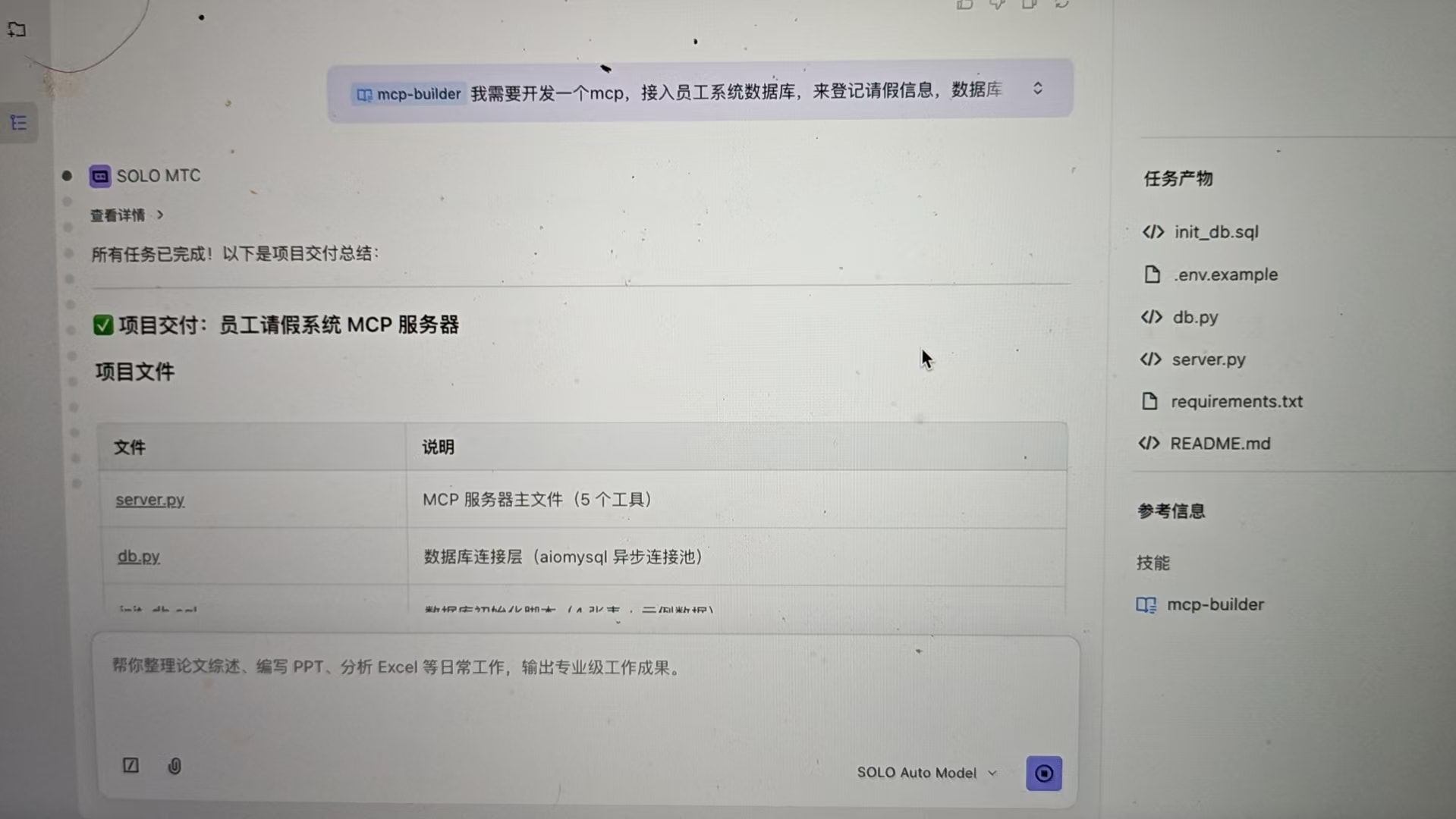 我首先向 SOLO 描述了我的需求:“开发一个 MCP 服务器,接入员工系统数据库,来登记请假信息,数据库为 MySQL”。SOLO 帮我将任务拆解为以下步骤: