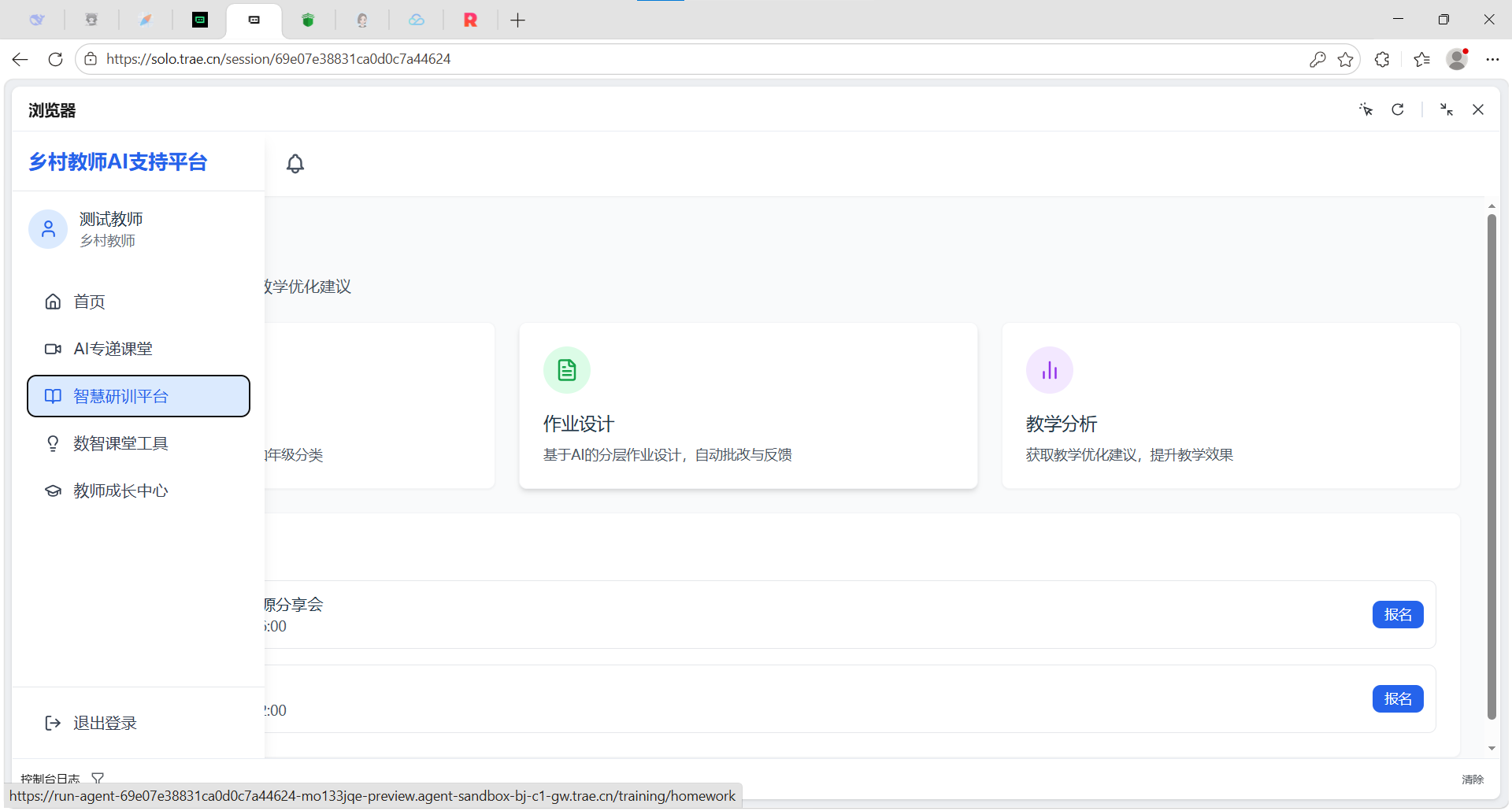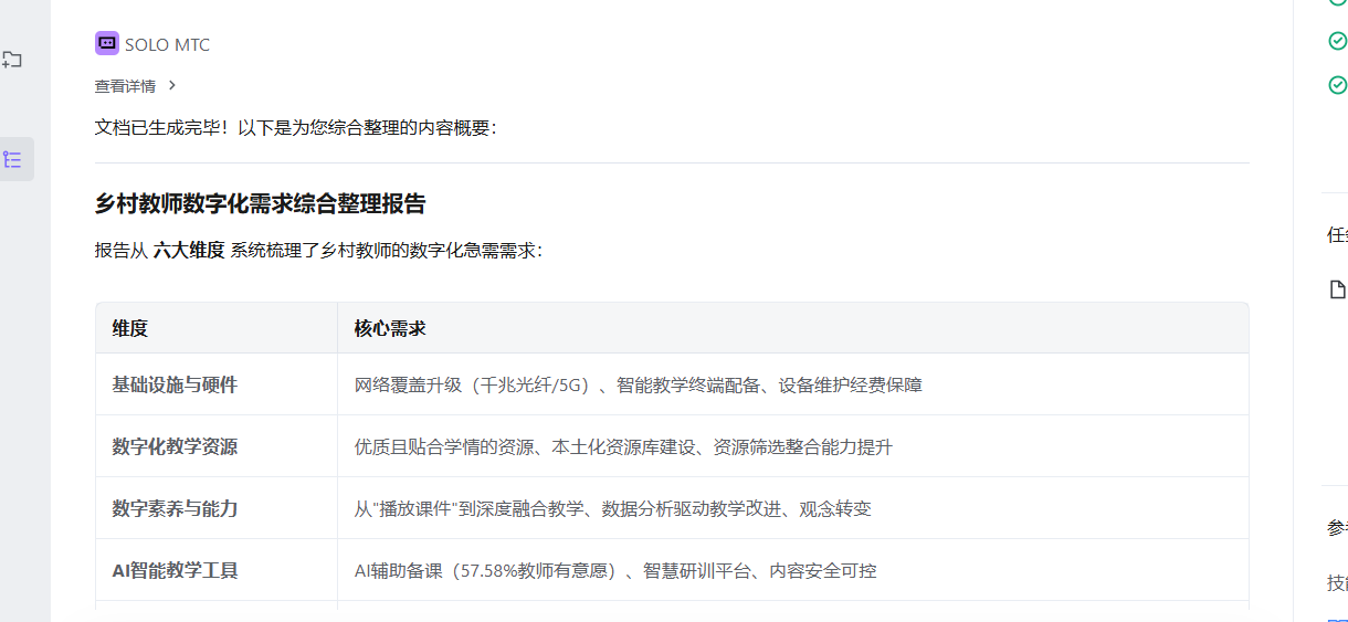 看到话题想起乡村教师的Ai问题,结合最近的Ai+教育的文件要求,先结合solo的文件分析,得到了最全最新的分析报告,又通过solo的代码能力生成了一个乡村教育AI应用案例,成功开发了一个综合性的乡村教师支持平台。