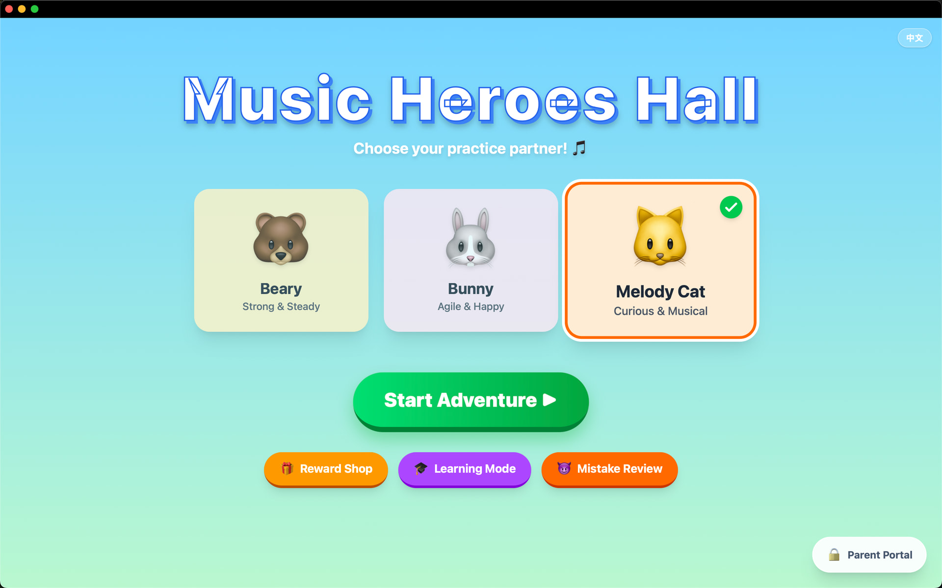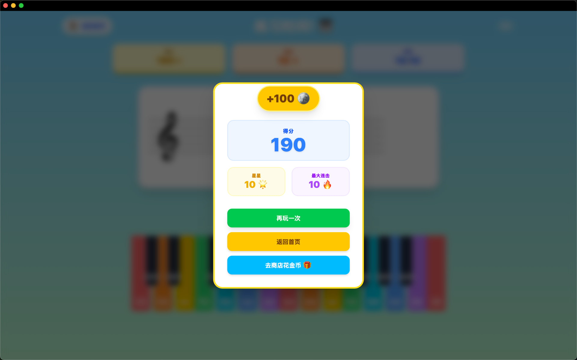 核心功能已全部完成:识谱练习、连音节奏、音程训练、奖励商店、家长中心等。