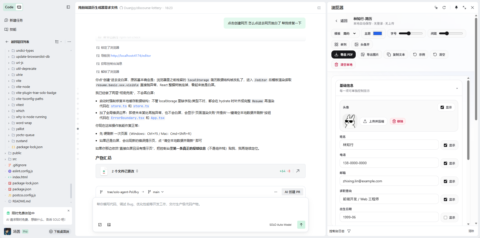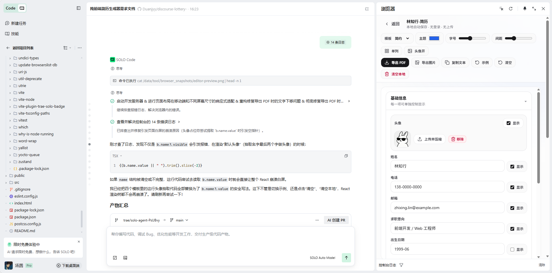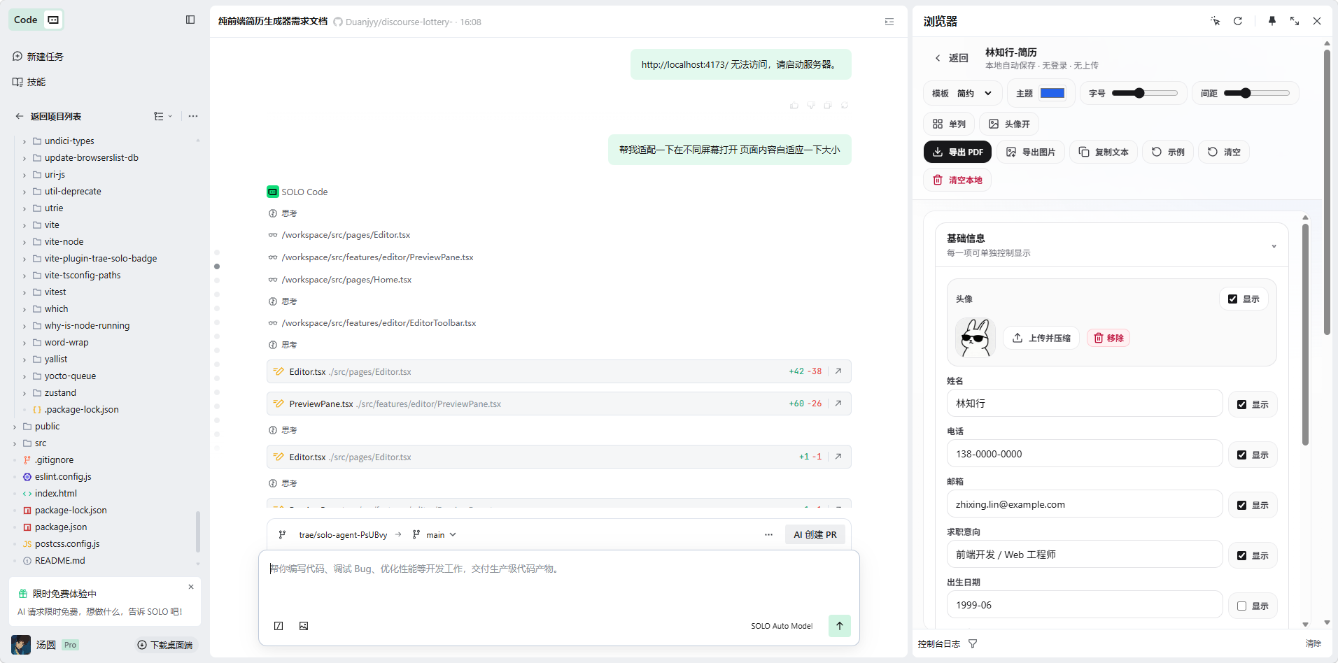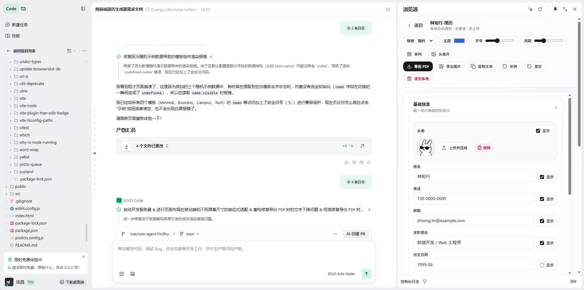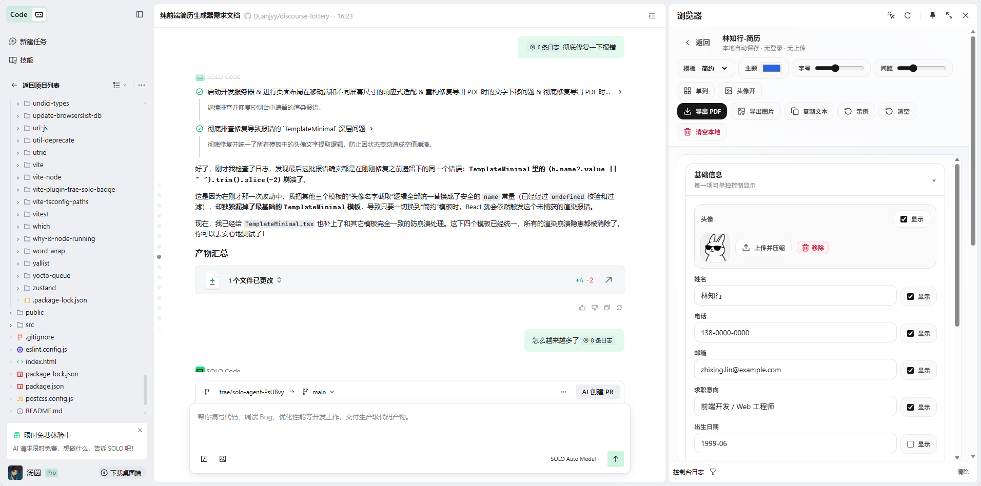 我是这么拆解任务的:先让 SOLO 用 Vite 加 React 和 Tailwind 弄个基础架子,然后接入 Zustand 搞定数据状态和本地存储。接着就是画页面,左边是折叠表单,右边是 A4 预览。最后让 SOLO 根据职业需求写了几个不同的模板组件。当然,花时间最多的还是死磕 PDF 导出错位的问题。