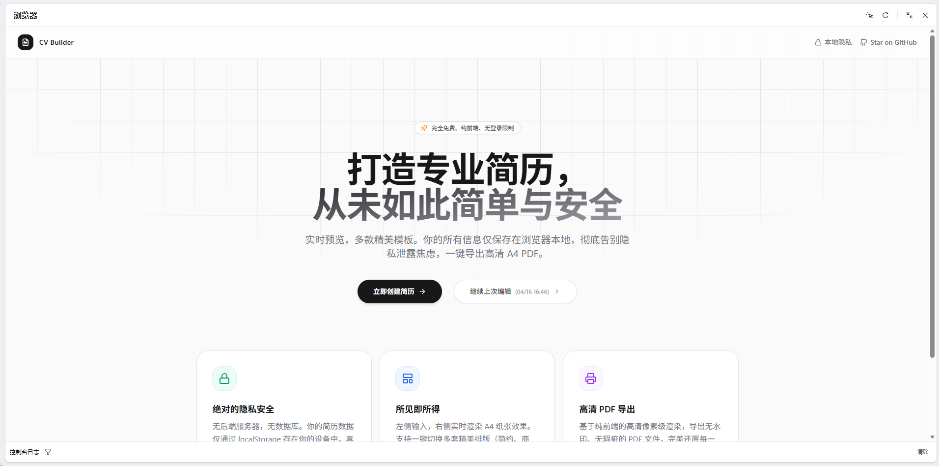 这个项目主要是给快毕业但不知道怎么写简历的在校大学生做的。是一个跑在浏览器里的纯前端简历生成器,点开就能用,不需要注册,数据也全都保存在你自己的电脑上,不用担心隐私泄露。经过我自己的测试,它导出的 PDF 非常清晰而且彻底解决了文字错位的毛病,希望能帮学弟学妹们省下排版的时间,多花点心思在内容打磨上。