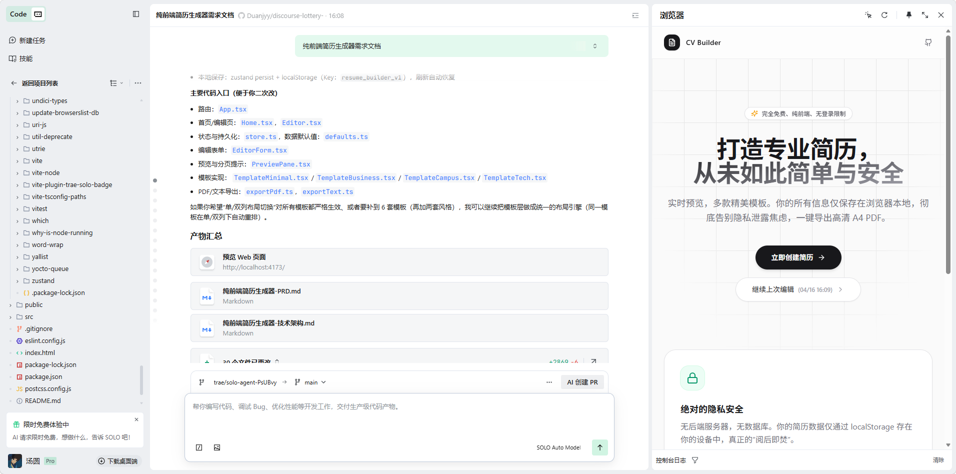 以前觉得搞这么一个完整、无错位、还能本地保护隐私的简历工具得肝好几个通宵,但这次在 TRAE SOLO 的辅助下,只用了极短的时间就跑通了全部闭环。