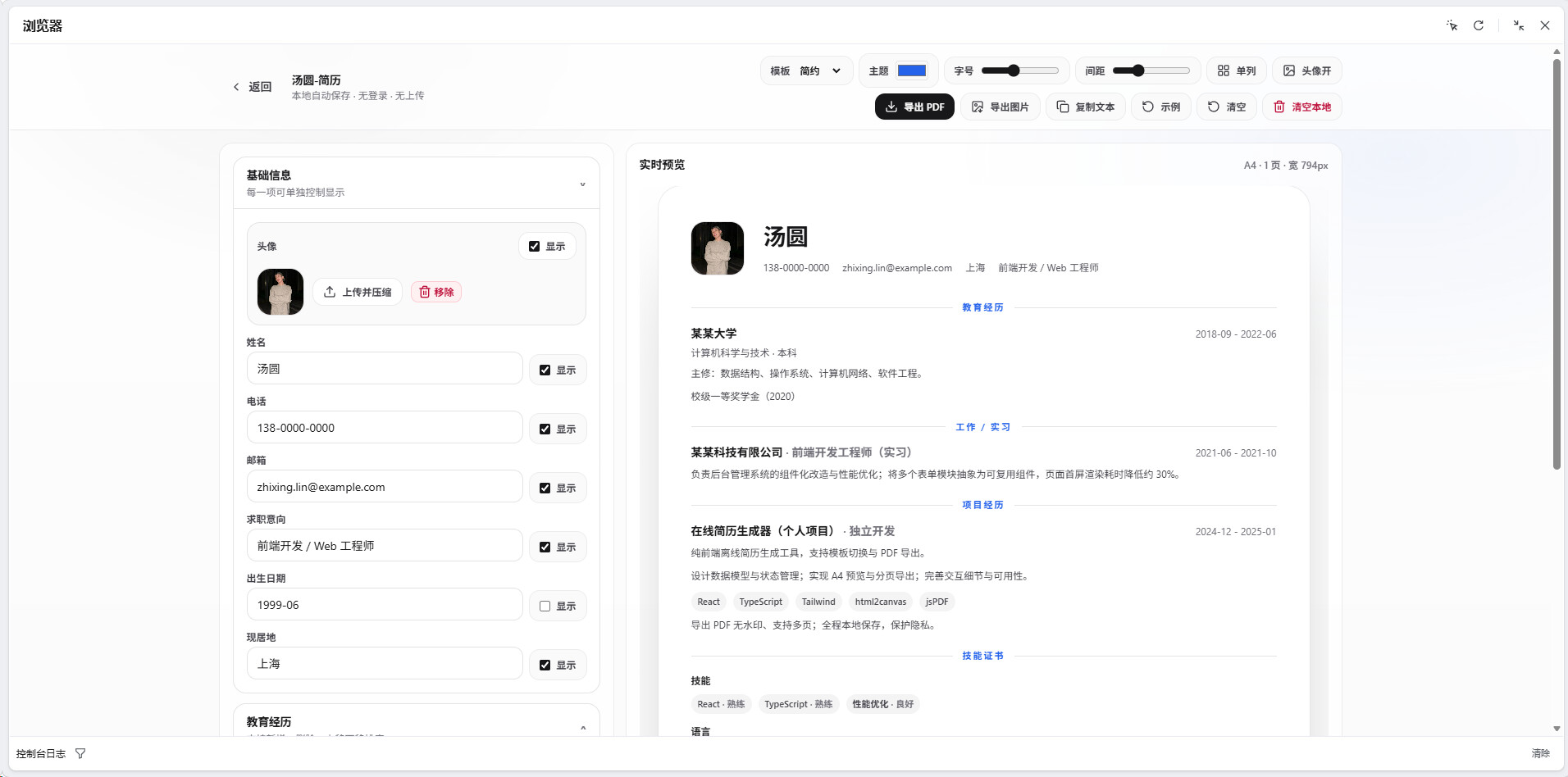 我就用 AI 自己做了个纯前端的简历小工具,全程离线跑,没有后端,你填的所有信息只存在浏览器本地缓存,谁也拿不到。里面自带简约、商务、校园、技术四套好用的模板,直接切换,不用自己调格式。左边填信息,右边实时看 A4 预览,字号间距还能微调。