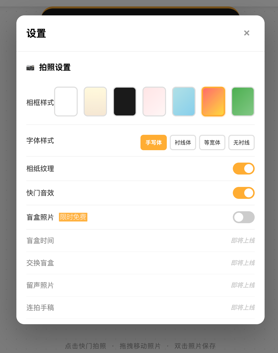 摇一摇显影:模拟拍立得的显影过程,用户需要通过摇晃手机(或鼠标晃动)让照片慢慢清晰