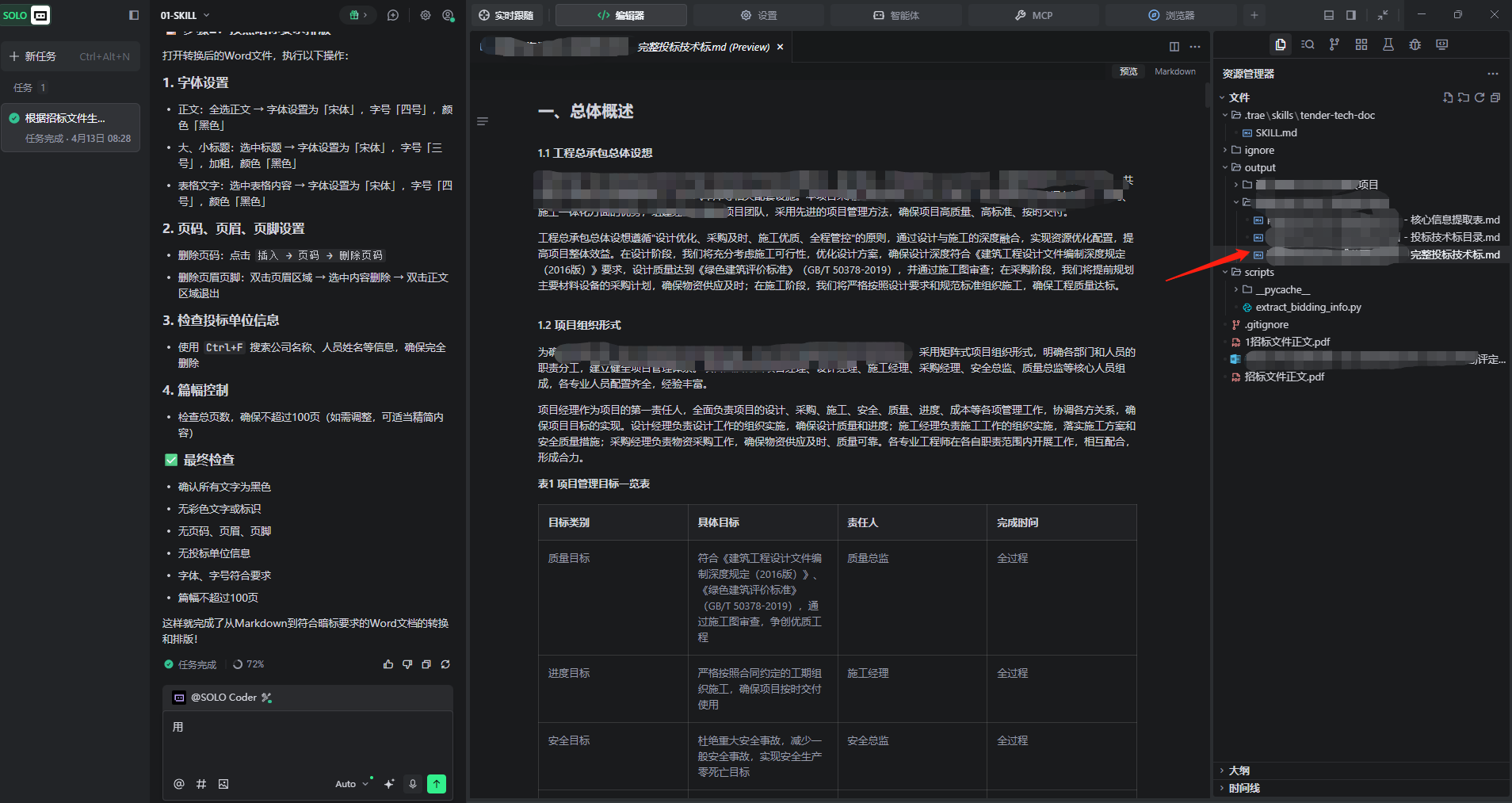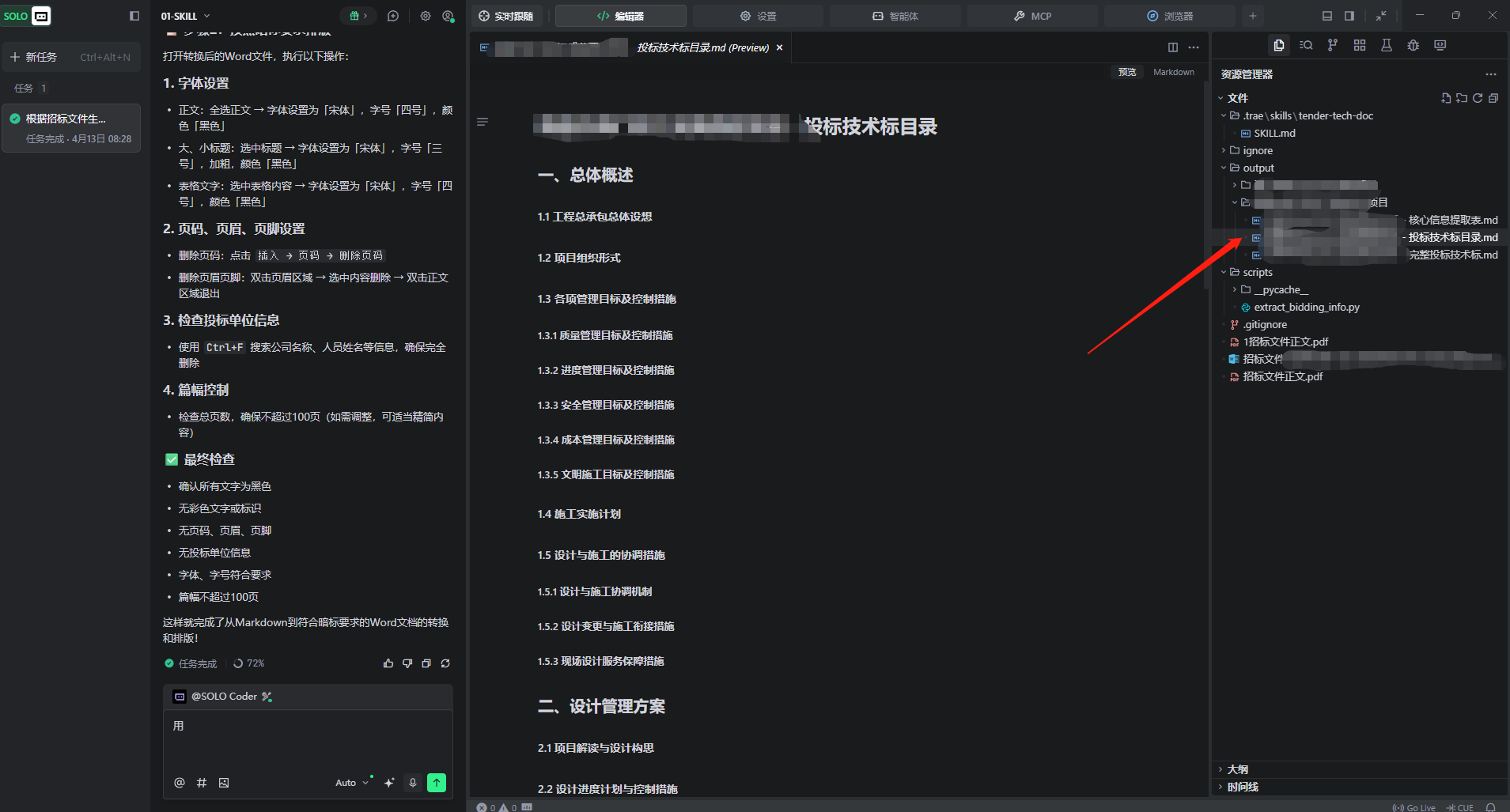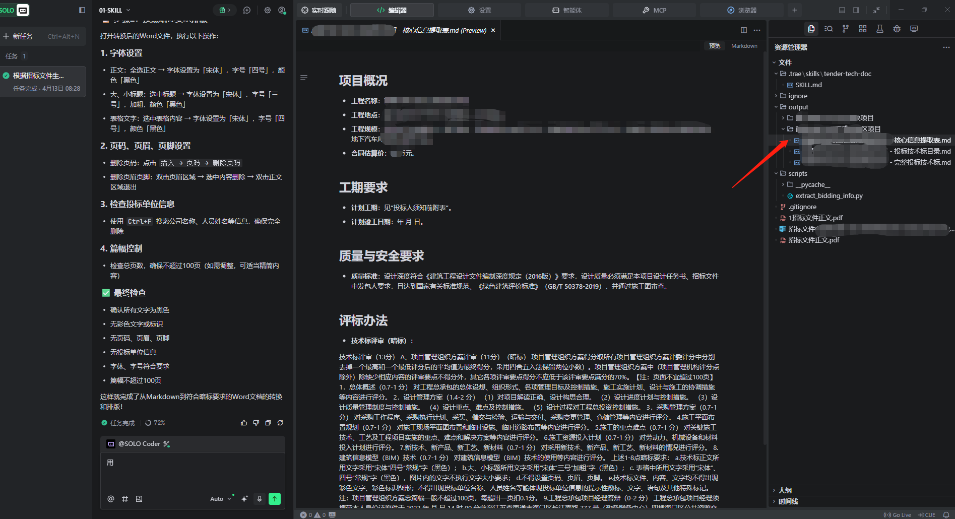 针对建筑行业招标文件阅读效率低、关键信息提取不全面、技术标编制周期长等行业痛点,借助 TRAE SOLO 工具构建智能投标解决方案。