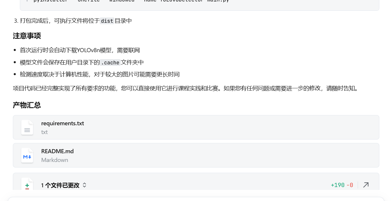 本项目借助 TRAE SOLO 高效实现了 YOLOv8 目标检测桌面工具,虽基于成熟模型开发,但重点体现了AI 工程化全流程实践:从需求到代码、从调试到部署、从环境到打包的完整闭环。