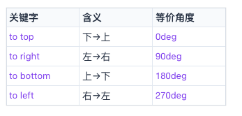 角度规则很简单:0deg 指向上方,顺时针递增。所以 90deg 指向右,180deg 指向下,45deg 指向右上。