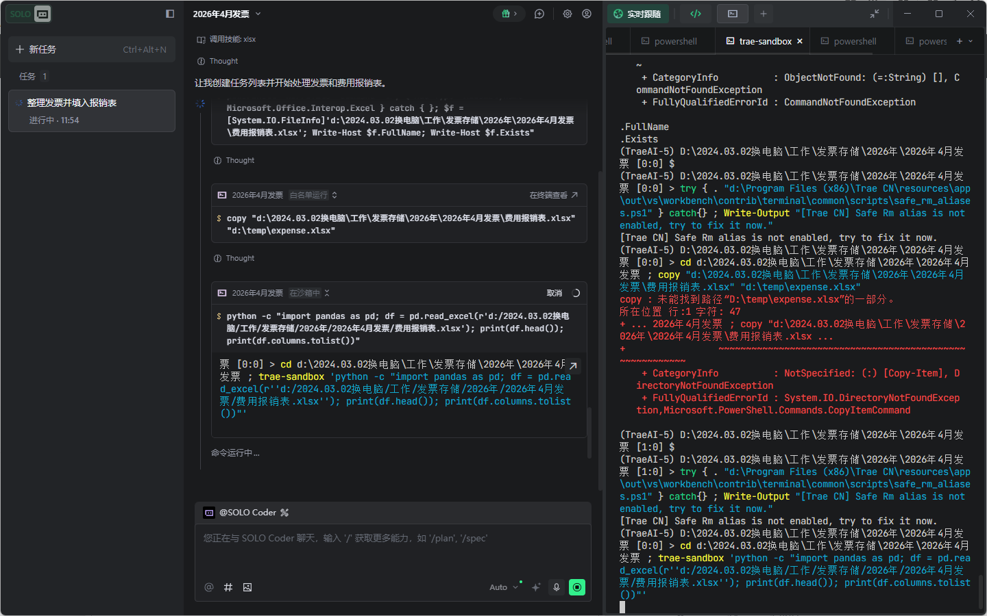 首先设定目标文件夹,将solo选中目标文件夹,日常存取的发票都无脑丢入到该文件夹中,然后将财务规定的标准化表格格式放进去,solo将自动使用openpyxl等工具对文件进行检索识别,然后进行归纳整理。。