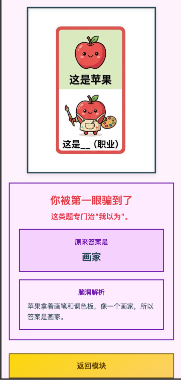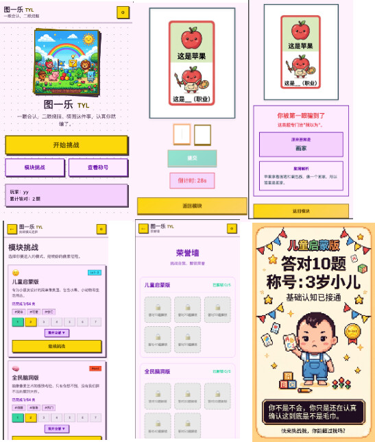 它不是普通“看图识物”,而是“先认图,再拐弯猜答案”,我把它做成了 儿童启蒙版 / 全民脑洞版 / 热门主题版 3 个模块,还配了一整套称号、分享海报和批量出图 Prompt,最后形成了一个可玩、可传播、可继续扩题库的产品雏形。